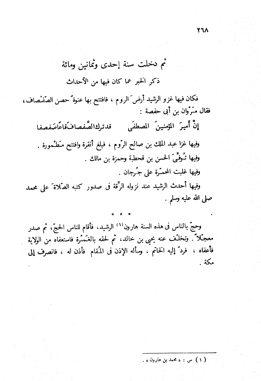 (ذكر الخبر عما كَانَ فِيهَا من الأحداث) فكان فيها غزو الرشيد أرض الروم، فافتتح بها عنوه حصن الصفصاف، فقال مروان بْن أبي حفصة: