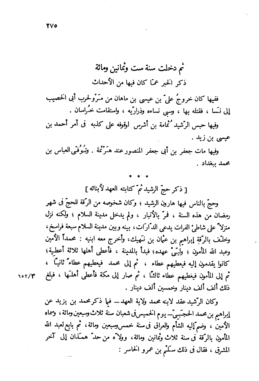(ذكر الخبر عما كَانَ فِيهَا من الأحداث) ففيها كان خروج علي بْن عيسى بْن ماهان من مرو لحرب أبي الخصيب إلى نسا، فقتله بها، وسبى نساءه وذراريه، واستقامت خراسان.