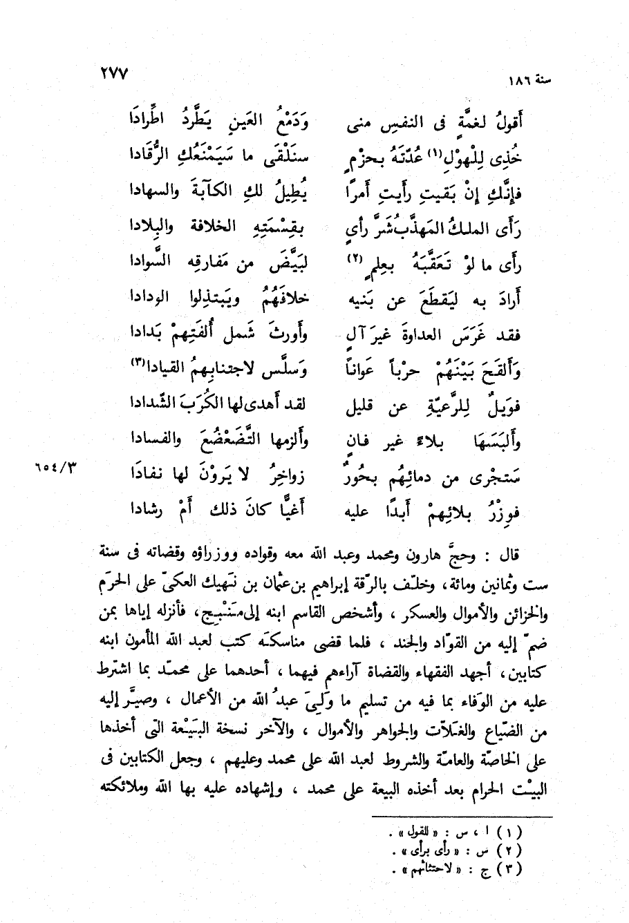 قال: وحج هارون ومحمد وعبد الله معه وقواده ووزراؤه وقضاته في سنة ست وثمانين ومائة، وخلف بالرقة إبراهيم بْن عثمان بْن نهيك العكي على الحرم والخزائن والأموال والعسكر، وأشخص القاسم ابنه إلى منبج، فانزله إياها بمن ضم إليه من القواد والجند، فلما قضى مناسكه كتب لعبد الله المأمون ابنه كتابين، أجهد الفقهاء والقضاة أراءهم فيهما، أحدهما على محمد بما اشترط عليه من الوفاء بما فيه من تسليم ما ولي عبد الله من الأعمال، وصير إليه من الضياع والغلات والجواهر والأموال، والآخر نسخة البيعة التي أخذها على الخاصة والعامة والشروط لعبد الله على محمد وعليهم، وجعل الكتابين في البيت الحرام بعد أخذه البيعة على محمد، وإشهاده عليه بها الله وملائكته