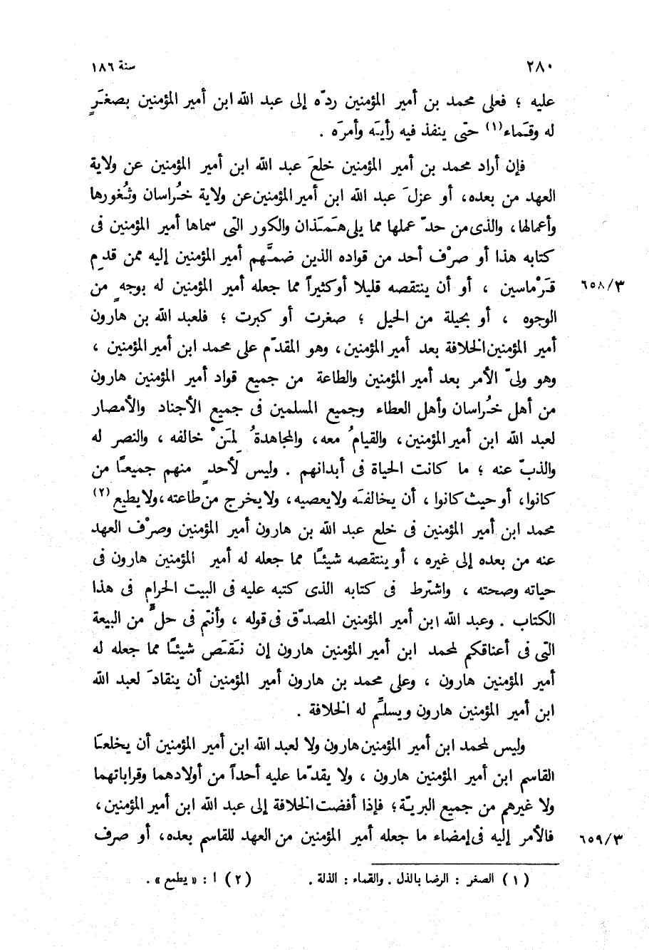 فإن أراد محمد بن امير المؤمنين خلع عبد الله ابْن أمير المؤمنين عن ولاية العهد من بعده، أو عزل عبد الله بن أمير المؤمنين عن ولاية خراسان وثغورها وأعمالها، والذي من حد عملها مما يلي همذان والكور التي سماها أمير المؤمنين في كتابه هذا أو صرف أحد من قواده الذين ضمهم أمير المؤمنين إليه ممن قدم قرماسين، أو أن ينتقصه قليلا أو كثيرا مما جعله أمير المؤمنين له بوجه من الوجوه، أو بحيلة من الحيل، صغرت أو كبرت، فلعبد الله بْن هارون أمير المؤمنين الخلافة بعد أمير المؤمنين، وهو المقدم على محمد ابن امير المؤمنين، وهو ولى الأمر بعد أمير المؤمنين والطاعة من جميع قواد أمير المؤمنين هارون من أهل خراسان وأهل العطاء وجميع المسلمين في جميع الأجناد والأمصار لعبد الله ابن أمير المؤمنين، والقيام معه، والمجاهدة لمن خالفه، والنصر له والذب عنه، ما كانت الحياة في أبدانهم وليس لأحد منهم جميعا من كانوا، أو حيث كانوا، أن يخالفه ولا يعصيه، ولا يخرج من طاعته، ولا يطيع محمد ابن أمير المؤمنين في خلع عبد الله بْن هارون أمير المؤمنين وصرف العهد عنه من بعده إلى غيره، أو ينتقصه شيئا مما جعله له أمير المؤمنين هارون في حياته وصحته، واشترط في كتابه الذي كتبه عليه في البيت الحرام في هذا الكتاب وعبد الله ابْن أمير المؤمنين المصدق في قوله، وأنتم في حل من البيعة التي في أعناقكم لمحمد ابْن أمير المؤمنين هارون إن نقص شيئا مما جعله له أمير المؤمنين هارون، وعلى محمد بْن هارون أمير المؤمنين أن ينقاد لعبد الله ابْن أمير المؤمنين هارون ويسلم له الخلافة.