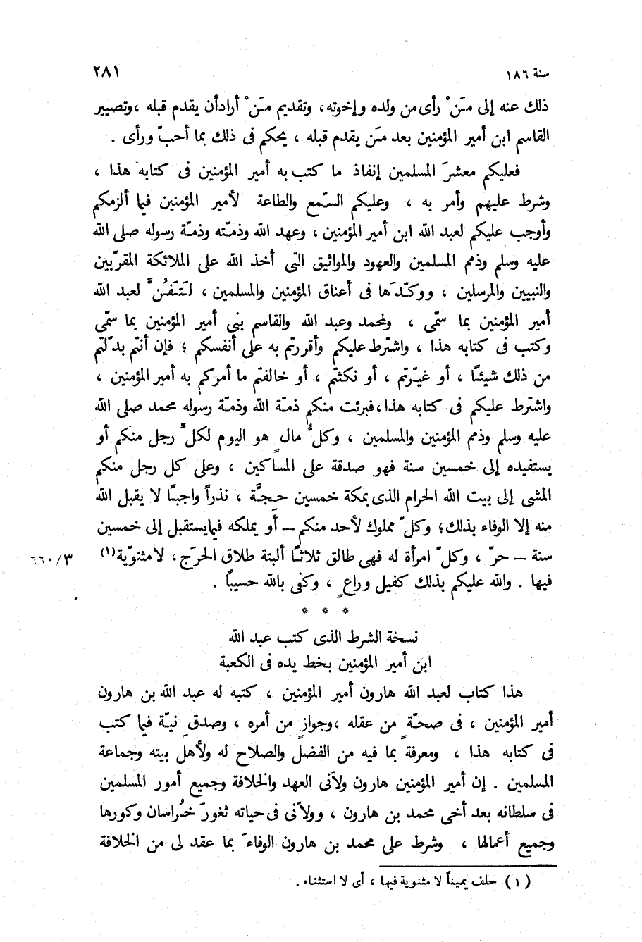 هذا كتاب لعبد الله هارون أمير المؤمنين، كتبه له عبد الله بْن هارون أمير المؤمنين، في صحة من عقله، وجواز من أمره، وصدق نية فيما كتب في كتابه هذا، ومعرفة بما فيه من الفضل والصلاح له ولأهل بيته وجماعة المسلمين إن أمير المؤمنين هارون ولاني العهد والخلافة وجميع أمور المسلمين في سلطانه بعد أخي محمد بْن هارون، وولاني في حياته ثغور خراسان وكورها وجميع أعمالها، وشرط على محمد بْن هارون الوفاء بما عقد لي من الخلافة