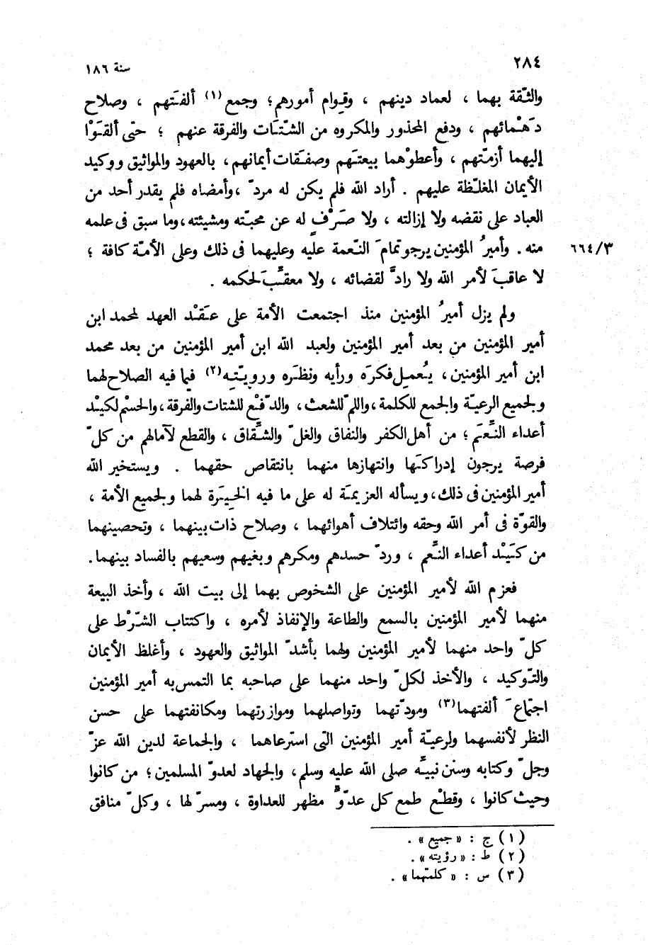 ولم يزل أمير المؤمنين منذ اجتمعت الأمة على عقد العهد لمحمد ابْن أمير المؤمنين من بعد أمير المؤمنين ولعبد الله ابْن أمير المؤمنين من بعد محمد ابْن أمير المؤمنين، يعمل فكره ورأيه ونظره ورويته فيما فيه الصلاح لهما ولجميع الرعية والجمع للكلمة، واللم للشعث، والدفع للشتات والفرقة، والحسم لكيد أعداء النعم، من أهل الكفر والنفاق والغل والشقاق، والقطع لآمالهم من كل فرصة يرجون إدراكها وانتهازها منهما بانتقاص حقهما ويستخير الله أمير المؤمنين في ذلك، ويسأله العزيمة له على ما فيه الخيرة لهما ولجميع الأمة، والقوة في أمر الله وحقه وائتلاف أهوائهما، وصلاح ذات بينهما، وتحصينهما من كيد أعداء النعم، ورد حسدهم ومكرهم وبغيهم وسعيهم بالفساد بينهما فعزم الله لأمير المؤمنين على الشخوص بهما إلى بيت الله، وأخذ البيعة منهما لأمير المؤمنين بالسمع والطاعة والإنفاذ لأمره، واكتتاب الشرط على كل واحد منهما لأمير المؤمنين ولهما بأشد المواثيق والعهود، وأغلظ الأيمان والتوكيد، والأخذ لكل واحد منهما على صاحبه بما التمس به أمير المؤمنين اجتماع ألفتهما ومودتهما وتواصلهما وموازرتهما ومكانفتهما على حسن النظر لأنفسهما ولرعية أمير المؤمنين التي استرعاهما، والجماعة لدين الله عز وجل وكتابه وسنن نبيه ص، والجهاد لعدو المسلمين، من كانوا وحيث كانوا، وقطع طمع كل عدو مظهر للعداوة، ومسر لها، وكل منافق