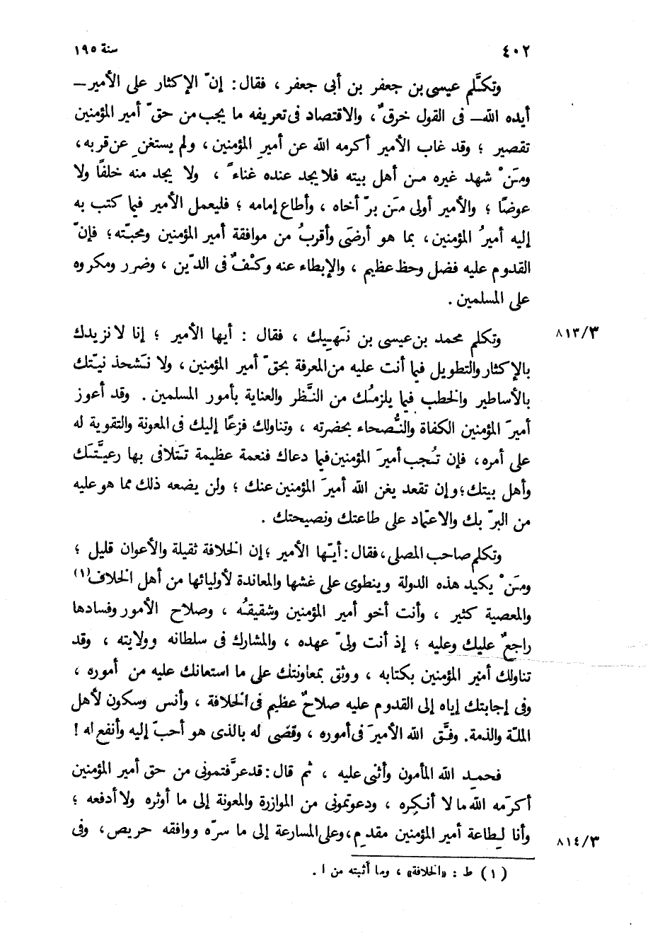 وتكلم عيسى بْن جعفر بْن أبي جعفر، فقال: ان الاكثار على الأمير- ايده الله- في القول خرق، والاقتصاد في تعريفه ما يجب من حق أمير المؤمنين تقصير، وقد غاب الأمير أكرمه الله عن أمير المؤمنين، ولم يستغن عن قربه، ومن شهد غيره من اهل بيته فلا يجد عنده غناء، ولا يجد منه خلفا ولا عوضا، والأمير أولى من بر أخاه، وأطاع إمامه، فليعمل الأمير فيما كتب به إليه أمير المؤمنين، بما هو أرضى وأقرب من موافقة أمير المؤمنين ومحبته، فإن القدوم عليه فضل وحظ عظيم، والإبطاء عنه وكف في الدين، وضرر ومكروه على المسلمين.