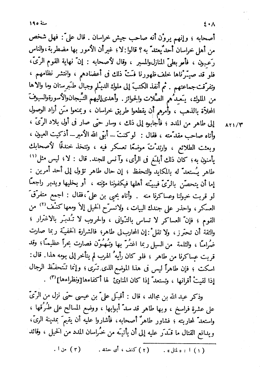 إما أن يتحصن بالري فيبيته أهلها فيكفوننا مؤنته، أو يخليها ويدبر راجعا لو قربت خيولنا وعساكرنا منه وأتاه يحيى بْن علي، فقال: اجمع متفرق العسكر، واحذر على جندك البيات، ولا تسرح الخيل إلا ومعها كنف من القوم، فإن العساكر لا تساس بالتواني، والحروب لا تدبر بالاغترار، والثقة أن تحترز، ولا تقل: إن المحارب لي طاهر، فالشرارة الخفية ربما صارت ضراما، والثلمة من السيل ربما اغتر بها وتهون فصارت بحرا عظيما، وقد قربت عساكرنا من طاهر، فلو كان رأيه الهرب لم يتأخر إلى يومه هذا قَالَ: