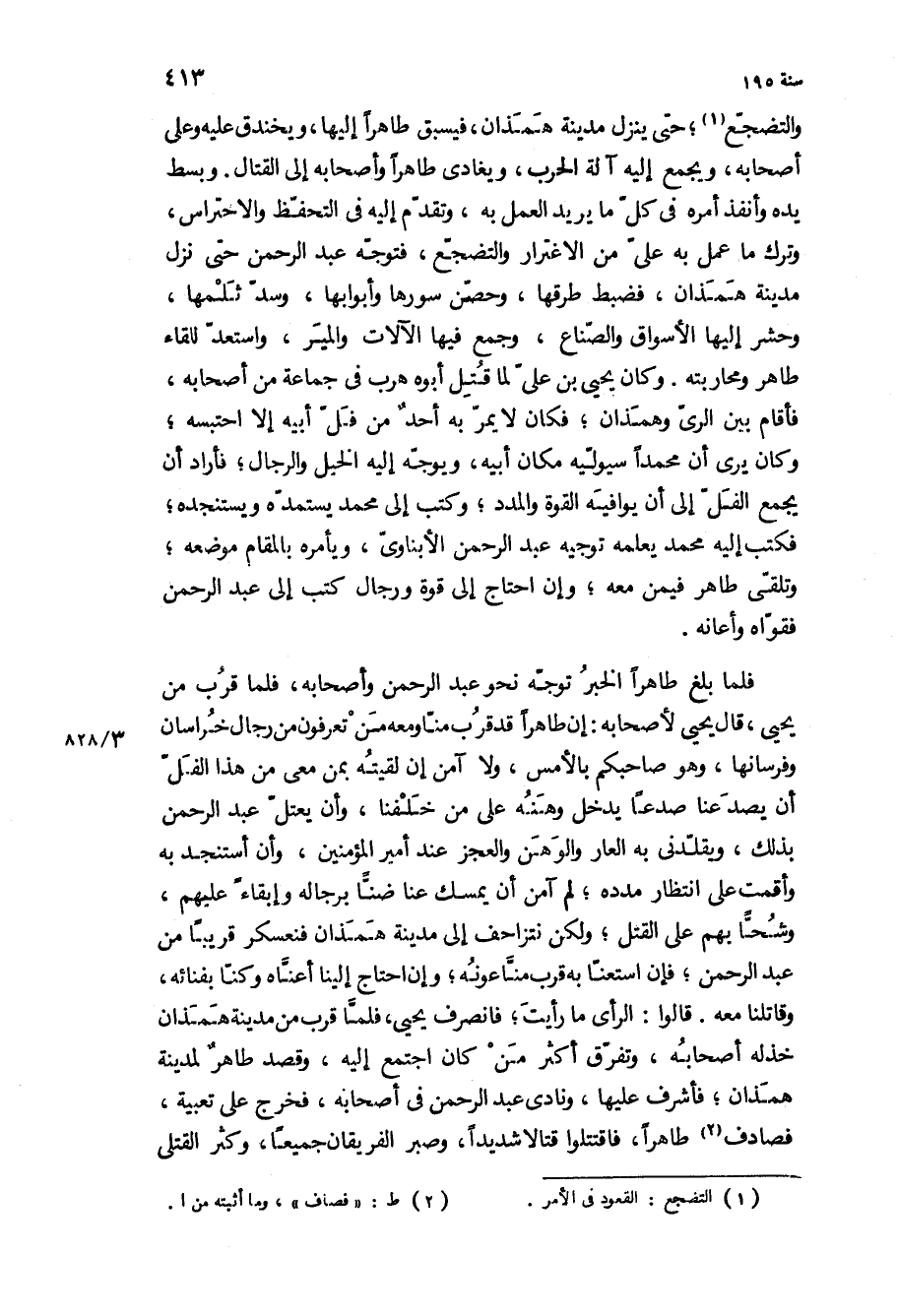 فلما بلغ طاهرا الخبر توجه نحو عبد الرحمن وأصحابه، فلما قرب من يحيى، قَالَ يحيى لأصحابه: إن طاهرا قد قرب منا ومعه من تعرفون من رجال خراسان وفرسانها، وهو صاحبكم بالأمس، ولا آمن إن لقيته بمن معي من هذا الفل أن يصدعنا صدعا يدخل وهنه على من خلفنا، وأن يعتل عبد الرحمن بذلك، ويقلدني به العار والوهن والعجز عند أمير المؤمنين، وأن أستنجد به واقمت على انتظار مدده، لم آمن أن يمسك عنا ضنا برجاله وإبقاء عليهم، وشحا بهم على القتل، ولكن نتزاحف إلى مدينة همذان فنعسكر قريبا من عبد الرحمن، فإن استعنا به قرب منا عونه، وإن احتاج إلينا أعناه وكنا بفنائه، وقاتلنا معه قالوا: الرأي ما رأيت، فانصرف يحيى، فلما قرب من مدينة همذان خذله أصحابه، وتفرق أكثر من كان اجتمع إليه، وقصد طاهر لمدينة همذان، فأشرف عليها، ونادى عبد الرحمن في أصحابه، فخرج على تعبئة، فصادف طاهرا، فاقتتلوا قتالا شديدا، وصبر الفريقان جميعا، وكثر القتلى