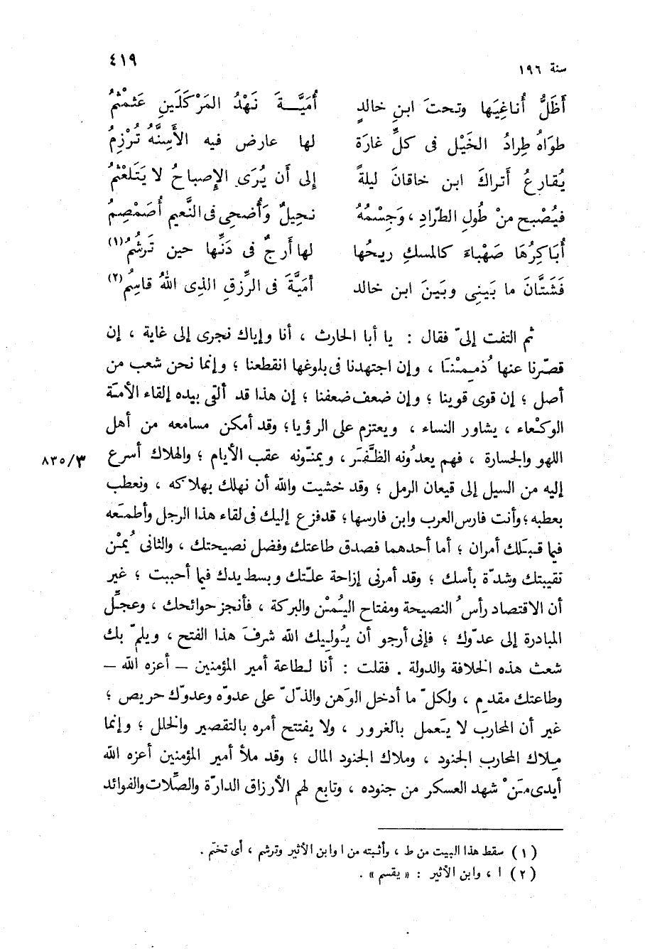ثم التفت إلي فقال: يا أبا الحارث، إنا وإياك نجري إلى غاية، إن قصرنا عنها ذممنا، وإن اجتهدنا في بلوغها انقطعنا، وإنما نحن شعب من أصل، إن قوي قوينا، وإن ضعف ضعفنا، إن هذا قد ألقى بيده إلقاء الأمة الوكعاء، يشاور النساء، ويعتزم على الرؤيا، وقد امكن مسامعه من أهل اللهو والجسارة، فهم يعدونه الظفر، ويمنونه عقب الأيام، والهلاك أسرع إليه من السيل إلى قيعان الرمل، وقد خشيت والله أن نهلك بهلاكه، ونعطب بعطبه، وأنت فارس العرب وابن فارسها، قد فزع إليك في لقاء هذا الرجل واطمعه فيما قبلك أمران، أما أحدهما فصدق طاعتك وفضل نصيحتك، والثاني يمن نقيبتك وشدة بأسك، وقد أمرني إزاحة علتك وبسط يدك فيما أحببت، غير أن الاقتصاد رأس النصيحة ومفتاح اليمن والبركة، فأنجز حوائجك، وعجل المبادرة إلى عدوك، فإني أرجو أن يوليك الله شرف هذا الفتح، ويلم بك شعث هذه الخلافة والدولة فقلت: أنا لطاعة أمير المؤمنين- أعزه الله- وطاعتك مقدم، ولكل ما أدخل الوهن والذل على عدوه وعدوك حريص، غير أن المحارب لا يعمل بالغرور، ولا يفتتح أمره بالتقصير والخلل، وإنما ملاك المحارب الجنود، وملاك الجنود المال، وقد ملأ أمير المؤمنين أعزه الله أيدي من شهد العسكر من جنوده، وتابع لهم الأرزاق الدارة والصلات والفوائد