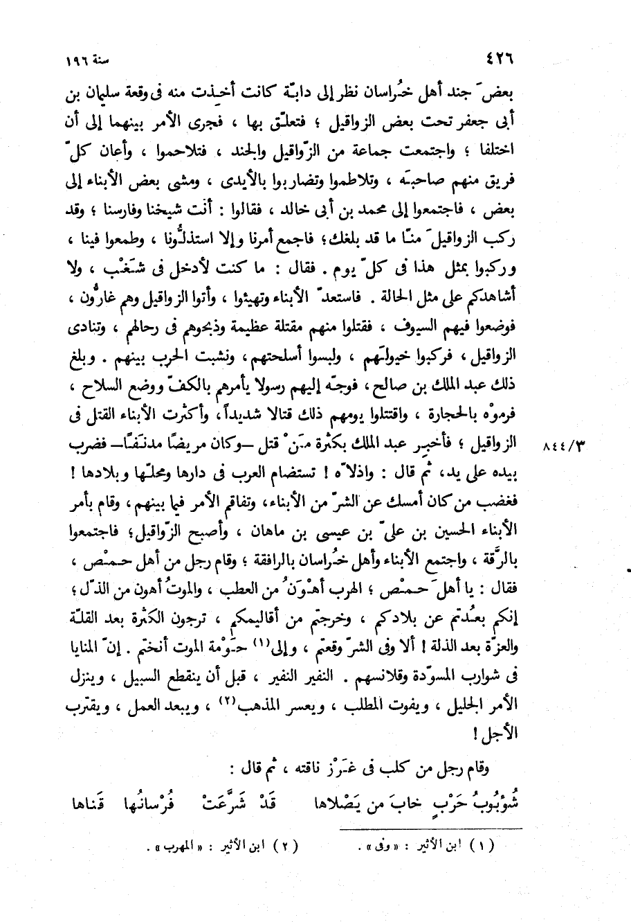 بعض جند أهل خراسان نظر إلى دابة كانت أخذت منه في وقعة سليمان بْن أبي جعفر تحت بعض الزواقيل، فتعلق بها، فجرى الأمر بينهما إلى أن اختلفا، واجتمعت جماعة من الزواقيل والجند، فتلاحموا، وأعان كل فريق منهم صاحبه، وتلاطموا وتضاربوا بالأيدي، ومشى بعض الأبناء إلى بعض، فاجتمعوا إلى محمد بن ابى خالد، فقالوا: أنت شيخنا وفارسنا، وقد ركب الزواقيل منا ما قد بلغك، فاجمع أمرنا وإلا استذلونا، وطمعوا فينا، وركبوا بمثل هذا في كل يوم فقال: ما كنت لأدخل في شغب، ولا أشاهدكم على مثل الحالة فاستعد الأبناء وتهيئوا، وأتوا الزواقيل وهم غارون، فوضعوا فيهم السيوف، فقتلوا منهم مقتلة عظيمة وذبحوهم في رحالهم، وتنادى الزواقيل، فركبوا خيولهم، ولبسوا أسلحتهم، ونشبت الحرب بينهم وبلغ ذلك عبد الملك بْن صالح، فوجه إليهم رسولا يأمرهم بالكف ووضع السلاح، فرموه بالحجارة، واقتتلوا يومهم ذلك قتالا شديدا، وأكثرت الأبناء القتل في الزواقيل، فأخبر عبد الملك بكثرة من قتل- وكان مريضا مدنفا- فضرب بيده على يد، ثم قال: وا ذلاه! تستضام العرب في دارها ومحلها وبلادها! فغضب من كان أمسك عن الشر من الأبناء، وتفاقم الأمر فيما بينهم، وقام بأمر الأبناء الحسين بْن علي بْن عيسى بْن ماهان، وأصبح الزواقيل، فاجتمعوا بالرقة، واجتمع الأبناء وأهل خراسان بالرافقة، وقام رجل من أهل حمص، فقال: يا أهل حمص، الهرب أهون من العطب، والموت أهون من الذل، إنكم بعدتم عن بلادكم، وخرجتم من أقاليمكم، ترجون الكثرة بعد القلة والعزة بعد الذلة! ألا وفي الشر وقعتم، وإلى حومة الموت أنختم إن المنايا في شوارب المسودة وقلانسهم النفير النفير، قبل أن ينقطع السبيل، وينزل الأمر الجليل، ويفوت المطلب، ويعسر المذهب، ويبعد العمل، ويقترب الأجل! وقام رجل من كلب في غرز ناقته، ثم قَالَ: