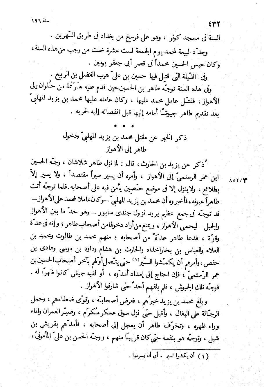 وفي هذه السنة توجه طاهر بْن الحسين حين قدم عليه هرثمة من حلوان إلى الأهواز، فقتل عامل محمد عليها، وكان عامله عليها محمد بْن يزيد المهلبي بعد تقديم طاهر جيوشا أمامه إليها قبل انفصاله إليه لحربه.