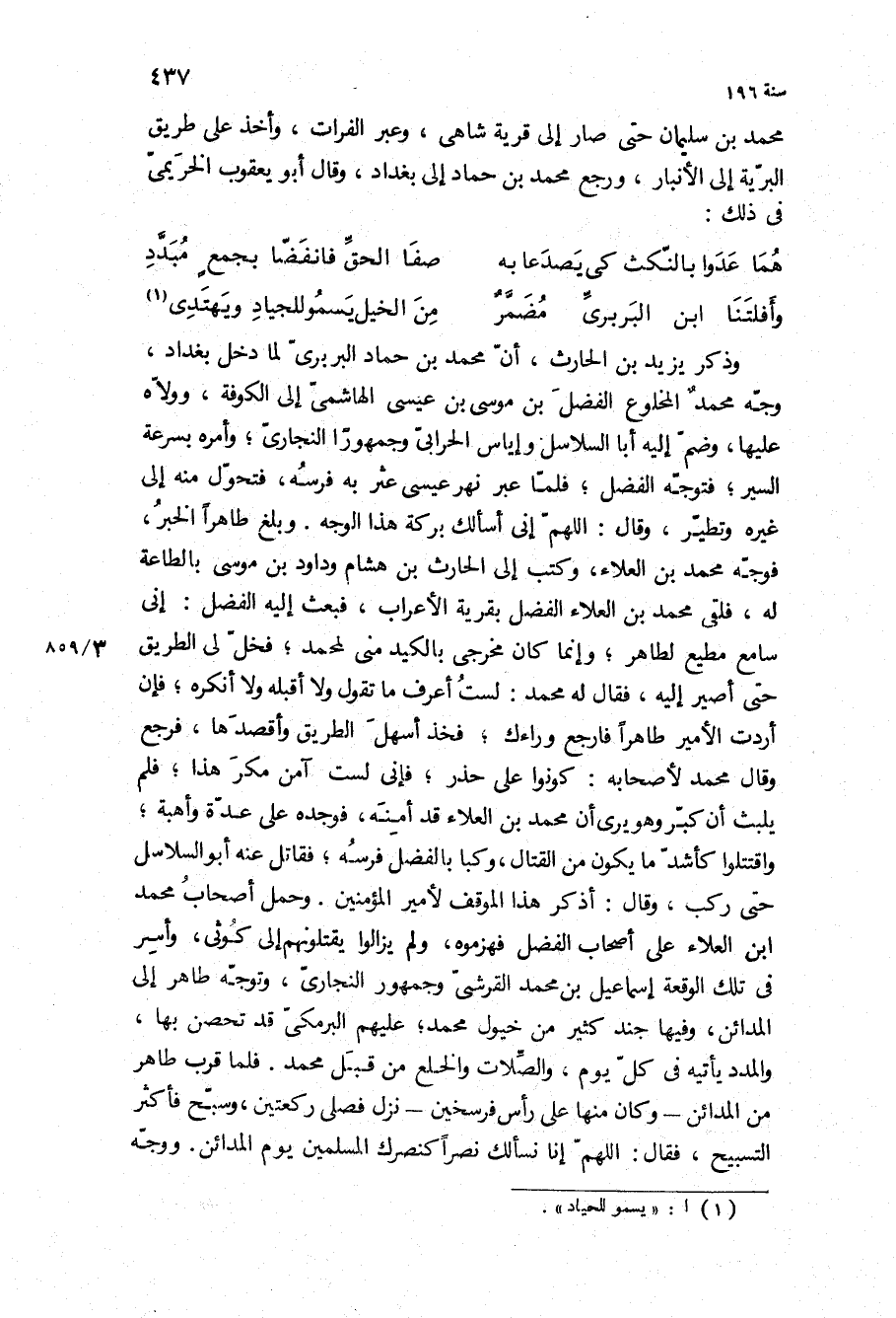 وذكر يزيد بن الحارث، ان محمد بْن حماد البربري لما دخل بغداد، وجه محمد المخلوع الفضل بْن موسى بْن عيسى الهاشمي إلى الكوفة، وولاه عليها، وضم إليه أبا السلاسل وإياس الحرابي وجمهورا النجاري، وأمره بسرعة السير، فتوجه الفضل، فلما عبر نهر عيسى عثر به فرسه، فتحول منه إلى غيره وتطير، وقال: اللهم إني أسألك بركة هذا الوجه وبلغ طاهرا الخبر، فوجه محمد بْن العلاء، وكتب إلى الحارث بْن هشام وداود بْن موسى بالطاعة له، فلقي محمد بْن العلاء الفضل بقرية الأعراب، فبعث إليه الفضل: إني سامع مطيع لطاهر، وإنما كان مخرجي بالكيد مني لمحمد، فخل لي الطريق حتى أصير إليه، فقال له محمد: لست أعرف ما تقول ولا أقبله ولا أنكره، فإن أردت الأمير طاهرا فارجع وراءك، فخذ أسهل الطريق وأقصدها، فرجع وقال محمد لأصحابه: كونوا على حذر، فإني لست آمن مكر هذا، فلم يلبث أن كبر وهو يرى أن محمد بْن العلاء قد آمنه، فوجده على عدة وأهبة، واقتتلوا كأشد ما يكون من القتال، وكبا بالفضل فرسه، فقاتل عنه أبو السلاسل حتى ركب، وقال: أذكر هذا الموقف لأمير المؤمنين وحمل اصحاب محمد ابن العلاء على اصحاب الفضل فهزموه، ولم يزالوا يقتلونهم إلى كوثى، وأسر في تلك الوقعة إسماعيل بْن محمد القرشي وجمهور النجارى، وتوجه طاهر إلى المدائن، وفيها جند كثير من خيول محمد، عليهم البرمكي قد تحصن بها، والمدد يأتيه في كل يوم، والصلات والخلع من قبل محمد فلما قرب طاهر من المدائن- وكان منها على رأس فرسخين- نزل فصلى ركعتين، وسبح فأكثر التسبيح، فقال: اللهم إنا نسألك نصرا كنصرك المسلمين يوم المدائن ووجه