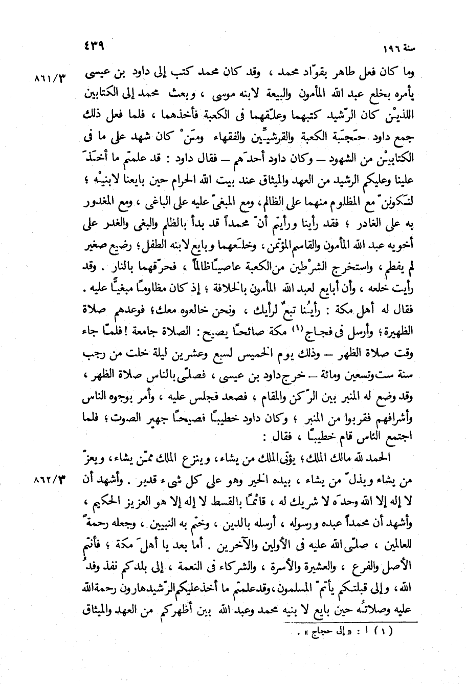 فقال له أهل مكة: رأينا تبع لرأيك، ونحن خالعوه معك، فوعدهم صلاة الظهيرة، وأرسل في فجاج مكة صائحا يصيح: الصلاة جامعة! فلما جاء وقت صلاة الظهر- وذلك يوم الخميس لسبع وعشرين ليلة خلت من رجب سنة ست وتسعين ومائة- خرج داود بْن عيسى، فصلى بالناس صلاة الظهر، وقد وضع له المنبر بين الركن والمقام، فصعد فجلس عليه، وأمر بوجوه الناس وأشرافهم فقربوا من المنبر، وكان داود خطيبا فصيحا جهير الصوت، فلما اجتمع الناس قام خطيبا، فقال: