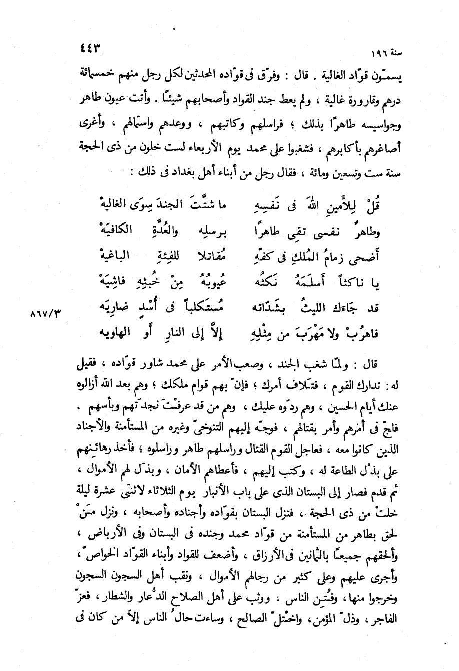 يسمون قواد الغالية قَالَ: وفرق في قواده المحدثين لكل رجل منهم خمسمائة درهم وقارورة غالية، ولم يعط جند القواد وأصحابهم شيئا وأتت عيون طاهر وجواسيسه طاهرا بذلك، فراسلهم وكاتبهم، ووعدهم واستمالهم، وأغرى أصاغرهم بأكابرهم، فشغبوا على محمد يوم الأربعاء لست خلون من ذي الحجة سنة ست وتسعين ومائة، فقال رجل من أبناء أهل بغداد في ذلك: