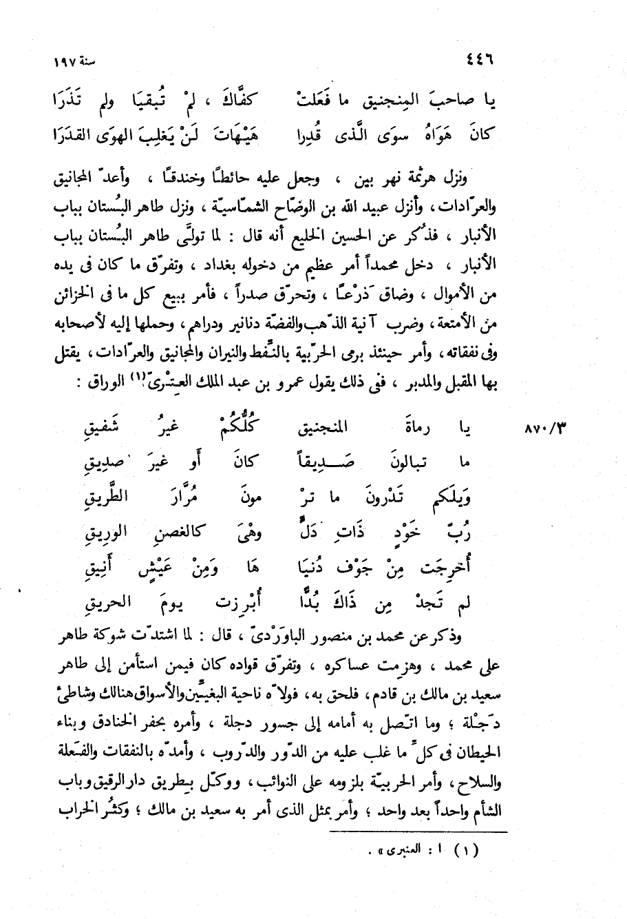 ونزل هرثمة نهر بين، وجعل عليه حائطا وخندقا، وأعد المجانيق والعرادات، وأنزل عبيد الله بْن الوضاح الشماسية، ونزل طاهر البستان بباب الأنبار، فذكر عن الحسين الخليع أنه قَالَ: لما تولى طاهر البستان بباب الأنبار، دخل محمدا أمر عظيم من دخوله بغداد، وتفرق ما كان في يده من الأموال، وضاق ذرعا، وتحرق صدرا، فأمر ببيع كل ما في الخزائن من الأمتعة، وضرب آنية الذهب والفضة دنانير ودراهم، وحملها إليه لأصحابه وفي نفقاته، وأمر حينئذ برمي الحربية بالنفط والنيران والمجانيق والعرادات، يقتل بها المقبل والمدبر، ففي ذلك يقول عمرو بْن عبد الملك العتري الوراق: