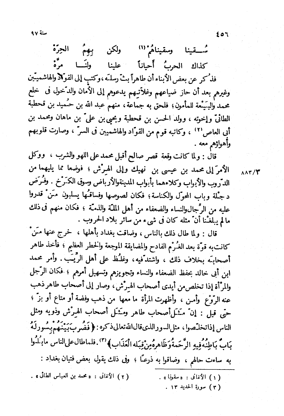 قَالَ: ولما طال ذلك بالناس، وضاقت بغداد بأهلها، خرج عنها من كانت به قوة بعد الغرم الفادح والمضايقة الموجعة والخطر العظيم، فأخذ طاهر أصحابه بخلاف ذلك، واشتد فيه، وغلظ على اهل الريب وامر محمد ابن أبي خالد بحفظ الضعفاء والنساء وتجويزهم وتسهيل أمرهم، فكان الرجل والمرأة إذا تخلص من أيدي أصحاب الهرش، وصار إلى أصحاب طاهر ذهب عنه الروع وأمن، وأظهرت المرأة ما معها من ذهب وفضة أو متاع أو بز، حتى قيل: إن مثل أصحاب طاهر ومثل أصحاب الهرش وذويه ومثل الناس إذا تخلصوا، مثل السور الذي قَالَ الله تعالى ذكره: «فَضُرِبَ بَيْنَهُمْ بِسُورٍ لَهُ بابٌ باطِنُهُ فِيهِ الرَّحْمَةُ وَظاهِرُهُ مِنْ قِبَلِهِ الْعَذابُ» فلما طال على الناس ما بلوا به ساءت حالهم، وضاقوا به ذرعا، وفي ذلك يقول بعض فتيان بغداد: