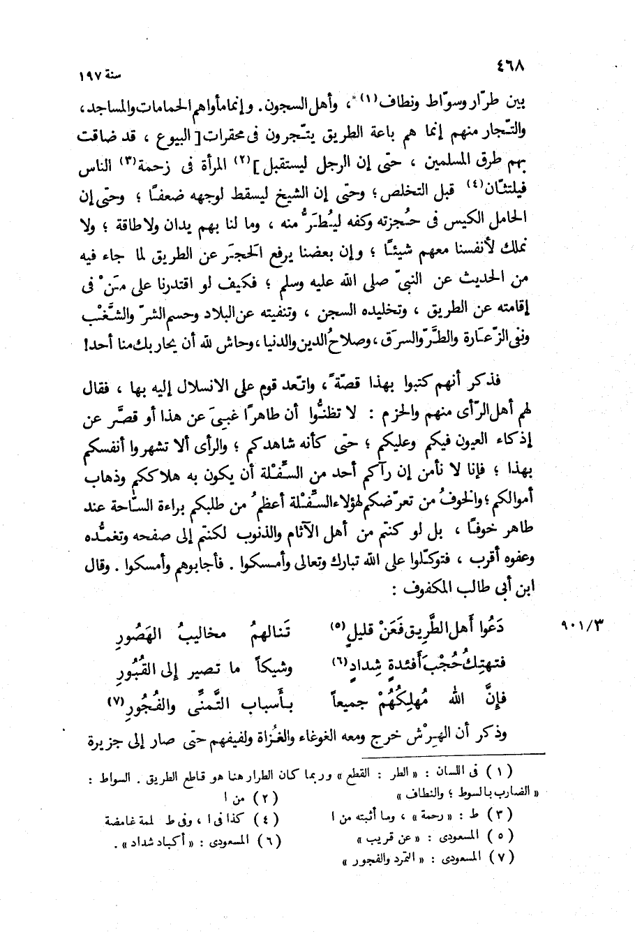 بين طرار وسواط ونطاف، وأهل السجون وإنما مأواهم الحمامات والمساجد، والتجار منهم إنما هم باعه الطريق يتجرون في محقرات البيوع، قد ضاقت بهم طرق المسلمين، حتى إن الرجل ليستقبل المرأة في زحمه الناس فيلتثان قبل التخلص، وحتى أن الشيخ ليسقط لوجهه ضعفا، وحتى أن الحامل الكيس في حجزته وكفه ليطر منه، وما لنا بهم يدان ولا طاقة، ولا نملك لأنفسنا معهم شيئا، وأن بعضنا يرفع الحجر عن الطريق لما جاء فيه من الحديث عن النبي ص، فكيف لو اقتدرنا على من في إقامته عن الطريق، وتخليده السجن، وتنفيته عن البلاد وحسم الشر والشغب ونفى الزعارة والطر والسرق، وصلاح الدين والدنيا، وحاش لله أن يحاربك منا أحد! فذكر أنهم كتبوا بهذا قصه، واتعد قوم على الانسلال إليه بها، فقال لهم أهل الرأي منهم والحزم: لا تظنوا أن طاهرا غبي عن هذا أو قصر عن إذكاء العيون فيكم وعليكم، حتى كأنه شاهدكم، والرأي ألا تشهروا أنفسكم بهذا، فإنا لا نأمن إن رآكم أحد من السفلة أن يكون به هلاككم وذهاب أموالكم، والخوف من تعرضكم لهؤلاء السفلة أعظم من طلبكم براءة الساحة عند طاهر خوفا، بل لو كنتم من أهل الآثام والذنوب لكنتم إلى صفحه وتغمده وعفوه أقرب، فتوكلوا على الله تبارك وتعالى وأمسكوا فأجابوهم وأمسكوا وقال ابن أبي طالب المكفوف: