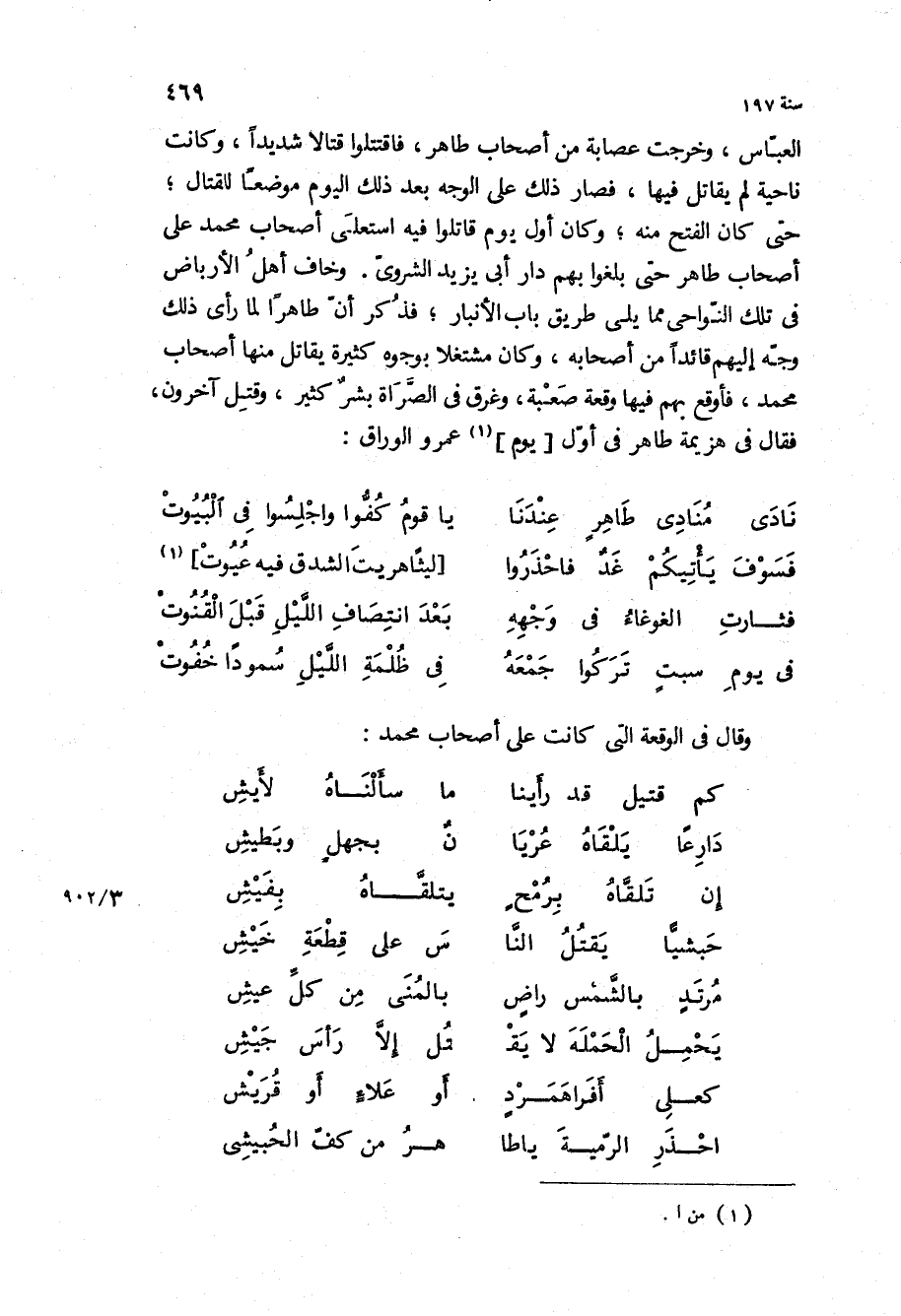 العباس، وخرجت عصابة من أصحاب طاهر، فاقتتلوا قتالا شديدا، وكانت ناحية لم يقاتل فيها، فصار ذلك على الوجه بعد ذلك اليوم موضعا للقتال، حتى كان الفتح منه، وكان أول يوم قاتلوا فيه استعلى أصحاب محمد على أصحاب طاهر حتى بلغوا بهم دار ابى يزيد الشروى وخاف أهل الأرباض في تلك النواحي مما يلي طريق باب الأنبار، فذكر أن طاهرا لما رأى ذلك وجه إليهم قائدا من أصحابه، وكان مشتغلا بوجوه كثيرة يقاتل منها اصحاب محمد، فاوقع بهم فيها وقعة صعبة، وغرق في الصراة بشر كثير، وقتل آخرون، فقال في هزيمة طاهر في أول يوم عمرو الوراق: