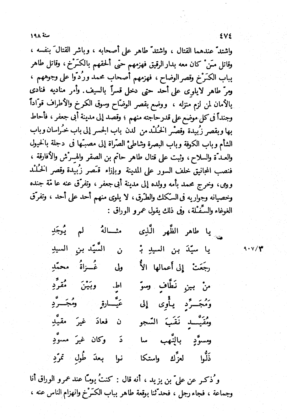 واشتد عندهما القتال، واشتد طاهر على أصحابه، وباشر القتال بنفسه، وقاتل من كان معه بدار الرقيق فهزمهم حتى ألحقهم بالكرخ، وقاتل طاهر بباب الكرخ وقصر الوضاح، فهزمهم أصحاب محمد وردوا على وجوههم، ومر طاهر لا يلوي على أحد حتى دخل قسرا بالسيف وأمر مناديه فنادى بالأمان لمن لزم منزله، ووضع بقصر الوضاح وسوق الكرخ والأطراف قوادا وجندا في كل موضع على قدر حاجته منهم، وقصد إلى مدينة أبي جعفر، فأحاط بها وبقصر زبيدة وقصر الخلد من لدن باب الجسر إلى باب خراسان وباب الشام وباب الكوفة وباب البصرة وشاطئ الصراة إلى مصبها في دجلة بالخيول والعدة والسلاح، وثبت على قتال طاهر حاتم بْن الصقر والهرش والأفارقة، فنصب المجانيق خلف السور على المدينة وبإزاء قصر زبيدة وقصر الخلد ورمى، وخرج محمد بأمه وولده إلى مدينة أبي جعفر، وتفرق عنه عامة جنده وخصيانه وجواريه في السكك والطرق، لا يلوي منهم أحد على أحد، وتفرق الغوغاء والسفلة، وفي ذلك يقول عمرو الوراق:
