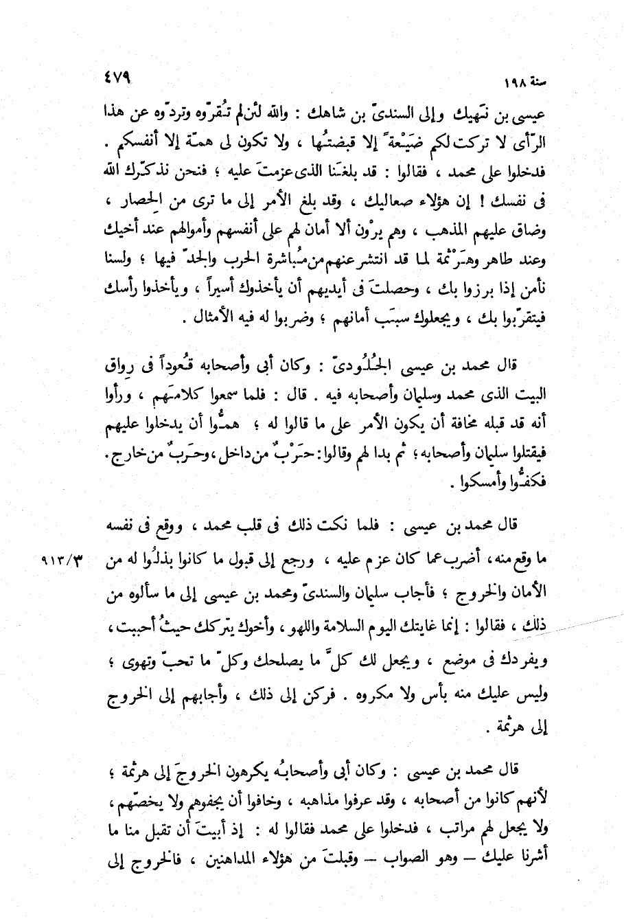 قَالَ محمد بْن عيسى: وكان أبي وأصحابه يكرهون الخروج إلى هرثمة، لأنهم كانوا من أصحابه، وقد عرفوا مذاهبه، وخافوا أن يجفوهم ولا يخصهم، ولا يجعل لهم مراتب، فدخلوا على محمد فقالوا له: إذ أبيت أن تقبل منا ما أشرنا عليك- وهو الصواب- وقبلت من هؤلاء المداهنين، فالخروج الى