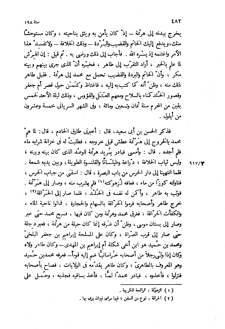 فوثب به طاهر، وأكمن له نفسه في الخلد، فلما صار إلى الحراقة، خرج طاهر وأصحابه فرموا الحراقة بالسهام والحجارة، فمالوا ناحية الماء، وانكفأت الحراقة، فغرق محمد وهرثمة ومن كان فيها، فسبح محمد حتى عبر وصار إلى بستان موسى، وظن أن غرقه إنما كان حيلة من هرثمة، فعبر دجلة حتى صار إلى قرب الصراة، وكان على المسلحة إبراهيم بن جعفر البلخى ومحمد بن حميد هو ابن أخي شكلة أم إبراهيم بْن المهدي- وكان طاهر ولاه وكان إذا ولى رجلا من أصحابه خراسانيا ضم إليه قوما- فعرفه محمد بْن حميد وهو المعروف بالطاهري، وكان طاهر يقدمه في الولايات، فصاح بأصحابه فنزلوا، فأخذوه، فبادر محمدا لما، فأخذ بساقيه فجذبه، وحمل على