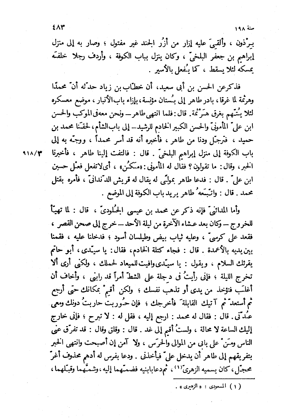 فذكر عن الحسن بْن أبي سعيد، أن خطاب بْن زياد حدثه أن محمدا وهرثمة لما غرقا، بادر طاهر إلى بستان مؤنسة، بإزاء باب الأنبار، موضع معسكره لئلا يتهم بغرق هرثمة قَالَ: فلما انتهى طاهر- ونحن معه في الموكب والحسن ابن علي المأموني والحسن الكبير الخادم للرشيد- إلى باب الشام، لحقنا محمد بْن حميد، فترجل ودنا من طاهر، فأخبره أنه قد أسر محمدا، ووجه به إلى باب الكوفة إلى منزل إبراهيم البلخي قَالَ: فالتفت إلينا طاهر، فأخبرنا الخبر، وقال: ما تقولون؟ فقال له المأموني: مكن، أي لا تفعل فعل حسين ابن علي قَالَ: فدعا طاهر بمولى له يقال له قريش الدنداني، فأمره بقتل محمد قَالَ: وأتبعه طاهر يريد باب الكوفة إلى الموضع.