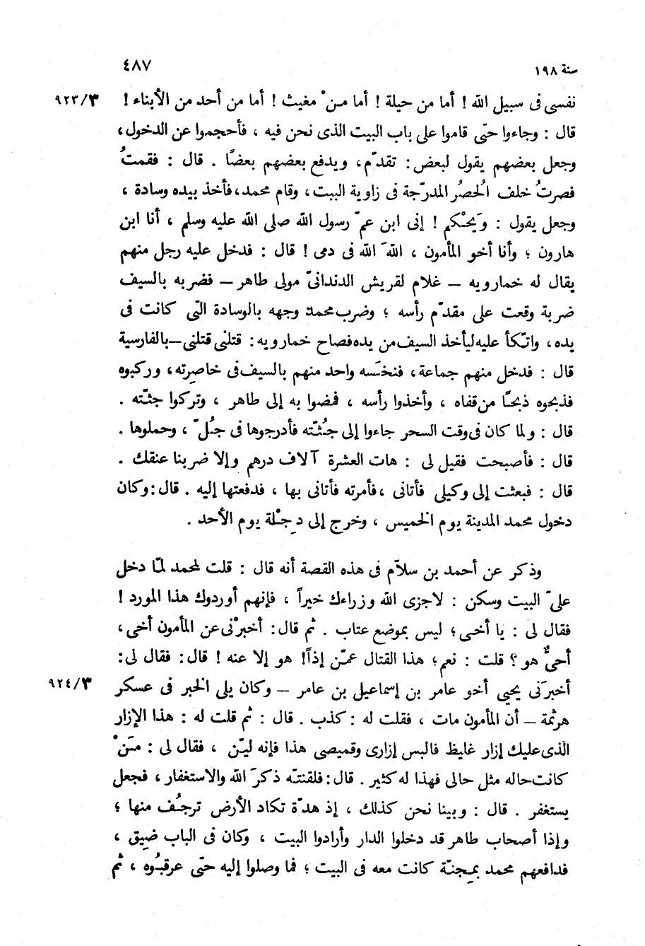 نفسي في سبيل الله! أما من حيلة! أما من مغيث! أما من أحد من الأبناء! قَالَ: وجاءوا حتى قاموا على باب البيت الذي نحن فيه، فأحجموا عن الدخول، وجعل بعضهم يقول لبعض: تقدم، ويدفع بعضهم بعضا قَالَ: فقمت فصرت خلف الحصر المدرجة في زاوية البيت، وقام محمد، فأخذ بيده وسادة، وجعل يقول: ويحكم! إني ابن عم رسول الله ص، أنا ابن هارون، وأنا أخو المأمون، الله الله في دمي! قَالَ: فدخل عليه رجل منهم يقال له خمارويه- غلام لقريش الدنداني مولى طاهر- فضربه بالسيف ضربة وقعت على مقدم رأسه، وضرب محمد وجهه بالوسادة التي كانت في يده، واتكأ عليه ليأخذ السيف من يده فصاح خمارويه: قتلني قتلني- بالفارسية قَالَ: فدخل منهم جماعة، فنخسه واحد منهم بالسيف في خاصرته، وركبوه فذبحوه ذبحا من قفاه، وأخذوا رأسه، فمضوا به إلى طاهر، وتركوا جثته.