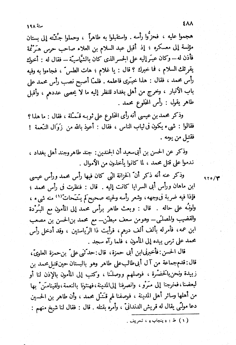 هجموا عليه، فحزوا رأسه واستقبلوا به طاهرا، وحملوا جثته إلى بستان مؤنسة إلى معسكره، إذ أقبل عبد السلام بْن العلاء صاحب حرس هرثمة فأذن له- وكان عبر إليه على الجسر الذي كان بالشماسية- فقال له: أخوك يقرئك السلام، فما خبرك؟ قَالَ: يا غلام، هات الطس، فجاءوا به وفيه رأس محمد، فقال: هذا خبري فأعلمه فلما أصبح نصب رأس محمد على باب الأنبار، وخرج من أهل بغداد للنظر إليه ما لا يحصى عددهم، وأقبل طاهر يقول: رأس المخلوع محمد.