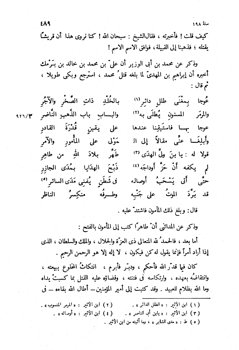 عوجا بمغنى طلل داثر بالخلد ذات الصخر والآجر والمرمر المسنون يطلى به والباب باب الذهب الناضر عوجا بها فاستيقنا عندها على يقين قدرة القادر وأبلغا عني مقالا إلى المولى على المأمور والأمر قولا له: يا بن ولي الهدى طهر بلاد الله من طاهر لم يكفه أن حز أوداجه ذبح الهدايا بمدى الجازر حتى أتى يسحب أوصاله في شطن يفنى مدى السائر قد برد الموت على جنبه وطرفه منكسر الناظر قَالَ: وبلغ ذلك المأمون فاشتد عليه.