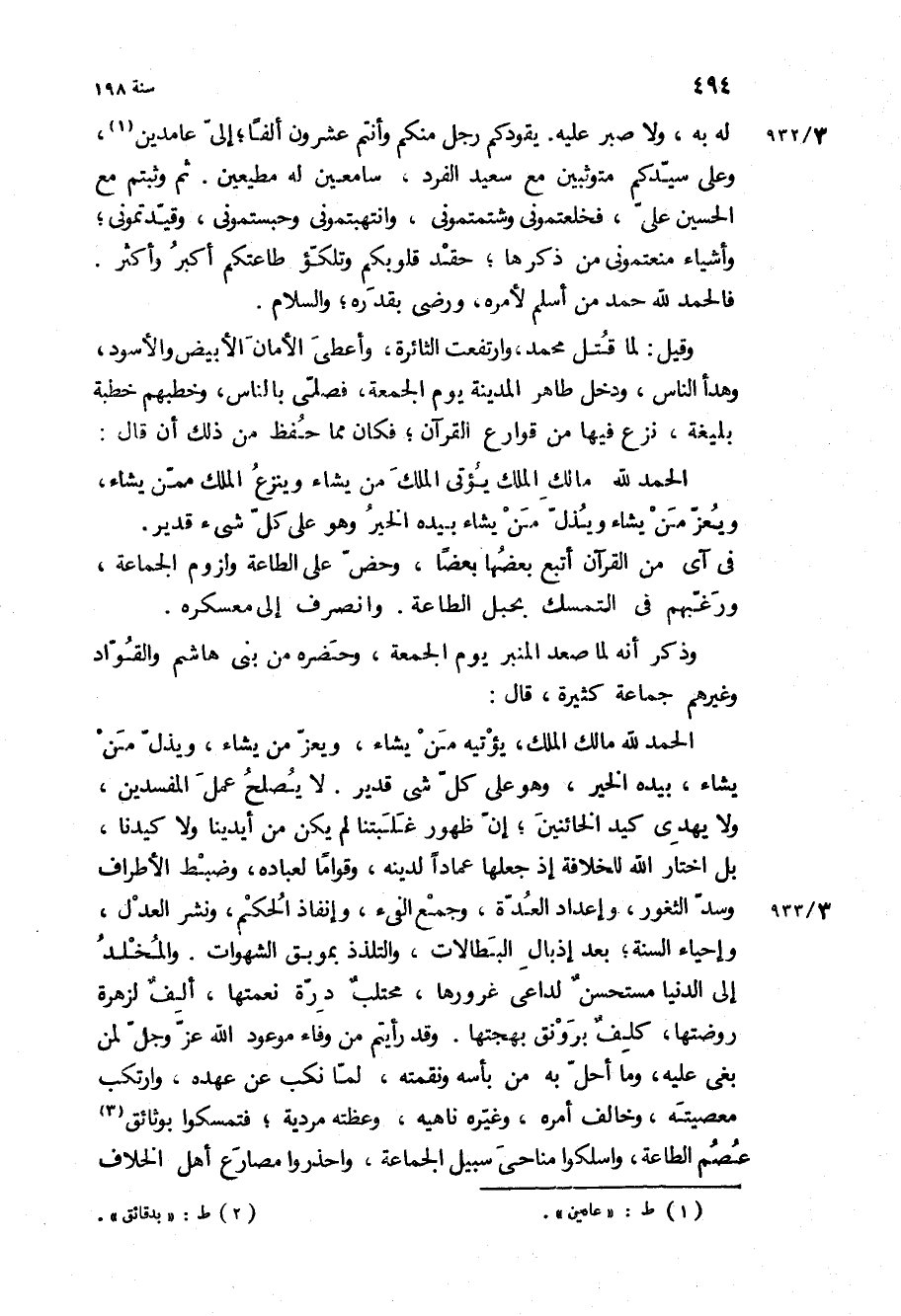 الحمد لله مالك الملك، يؤتيه من يشاء، ويعز من يشاء، ويذل من يشاء، بيده الخير، وهو عَلى كُلِّ شَيْءٍ قَدِيرٌ لا يصلح عمل المفسدين، ولا يهدي كيد الخائنين، إن ظهور غلبتنا لم يكن من أيدينا ولا كيدنا، بل اختار الله للخلافة إذ جعلها عمادا لدينه، وقواما لعباده، وضبط الأطراف وسد الثغور، وإعداد العدة، وجمع الفيء، وإنفاذ الحكم، ونشر العدل، وإحياء السنة، بعد إذبال البطالات، والتلذذ بموبق الشهوات والمخلد إلى الدنيا مستحسن لداعي غرورها، محتلب دره نعمتها، الف لزهره روضتها، كلف برونق بهجتها وقد رأيتم من وفاء موعود الله عز وجل لمن بغى عليه، وما أحل به من بأسه ونقمته، لما نكب عن عهده، وارتكب معصيته، وخالف أمره، وغيره ناهيه، وعظته مرديه، فتمسكوا بوثائق عصم الطاعة، واسلكوا مناحي سبيل الجماعة، واحذروا مصارع أهل الخلاف
