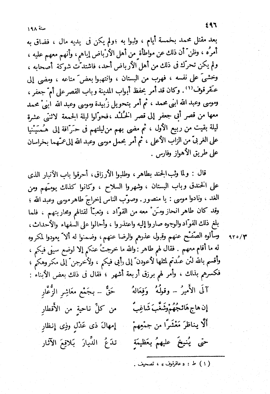 قَالَ: ولما وثب الجند بطاهر، وطلبوا الأرزاق، أحرقوا باب الأنبار الذي على الخندق وباب البستان، وشهروا السلاح، وكانوا كذلك يومهم ومن الغد، ونادوا موسى: يا منصور وصوب الناس إخراج طاهر موسى وعبد الله، وقد كان طاهر انحاز ومن معه من القواد، وتعبأ لقتالهم ومحاربتهم، فلما بلغ ذلك القواد والوجوه صاروا إليه واعتذروا، وأحالوا على السفهاء والأحداث، وسألوه الصفح عنهم وقبول عذرهم والرضا عنهم، وضمنوا له ألا يعودوا لمكروه له ما أقام معهم فقال لهم طاهر: والله ما خرجت عنكم إلا لوضع سيفي فيكم، وأقسم بالله لئن عدتم لمثلها لأعودن إلى رأيي فيكم، ولأخرجن إلى مكروهكم، فكسرهم بذلك، وأمر لهم برزق أربعة أشهر، فقال في ذلك بعض الأبناء: