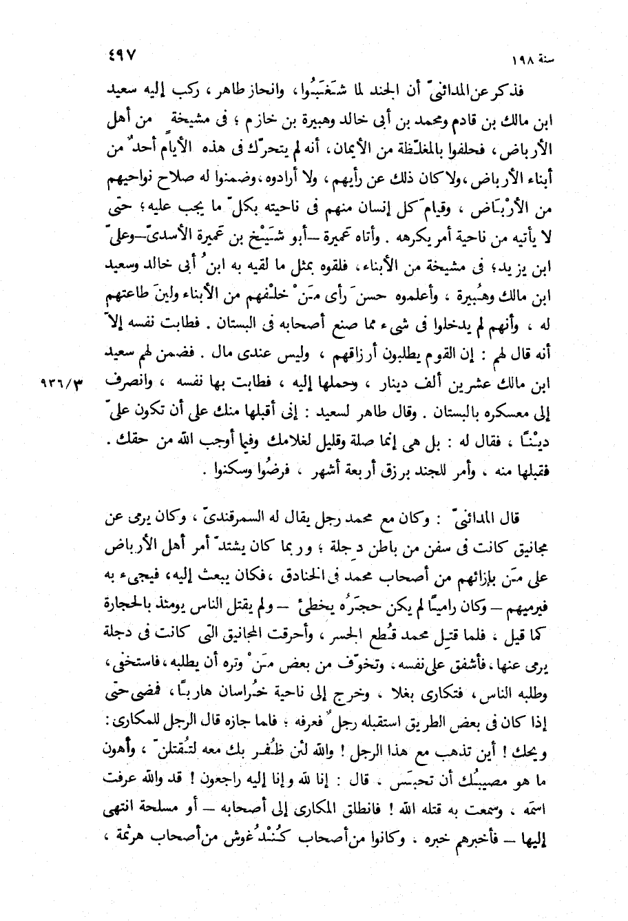 فذكر عن المدائني أن الجند لما شغبوا، وانحاز طاهر، ركب اليه سعيد ابن مالك بْن قادم ومحمد بْن أبي خالد وهبيرة بْن خازم، في مشيخة من أهل الأرباض، فحلفوا بالمغلظة من الأيمان، أنه لم يتحرك في هذه الأيام أحد من أبناء الأرباض، ولا كان ذلك عن رأيهم، ولا أرادوه، وضمنوا له صلاح نواحيهم من الأرباض، وقيام كل إنسان منهم في ناحيته بكل ما يجب عليه، حتى لا يأتيه من ناحية أمر يكرهه وأتاه عميرة- أبو شيخ بن عميرة الأسدي- وعلى ابن يزيد، في مشيخة من الأبناء، فلقوه بمثل ما لقيه به ابن أبي خالد وسعيد ابن مالك وهبيرة، وأعلموه حسن رأي من خلفهم من الأبناء ولين طاعتهم له، وأنهم لم يدخلوا في شيء مما صنع أصحابه في البستان فطابت نفسه إلا أنه قَالَ لهم: إن القوم يطلبون أرزاقهم، وليس عندي مال فضمن لهم سعيد ابن مالك عشرين ألف دينار، وحملها إليه، فطابت بها نفسه، وانصرف إلى معسكره بالبستان وقال طاهر لسعيد: إني أقبلها منك على أن تكون علي دينا، فقال له: بل هي إنما صلة وقليل لغلامك وفيما أوجب الله من حقك.