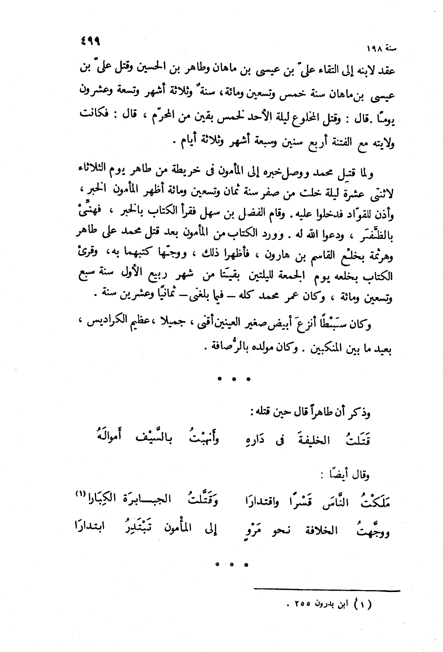 عقد لابنه الى التقاء علي بْن عيسى بْن ماهان وطاهر بْن الحسين وقتل علي بْن عيسى بْن ماهان سنة خمس وتسعين ومائة، سنة وثلاثة أشهر وتسعة وعشرون يوما قَالَ: وقتل المخلوع ليلة الأحد لخمس بقين من المحرم، قَالَ: فكانت ولايته مع الفتنة أربع سنين وسبعة أشهر وثلاثة أيام.