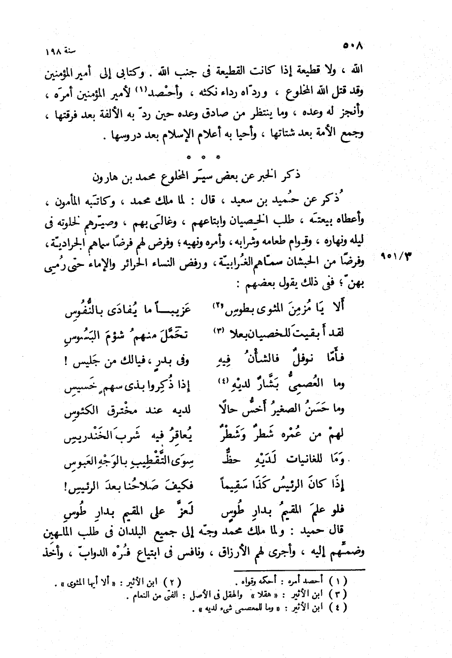 الله، ولا قطيعة إذا كانت القطيعة في جنب الله وكتابي إلى أمير المؤمنين وقد قتل الله المخلوع، ورداه رداء نكثه، وأحصد لأمير المؤمنين أمره، وأنجز له وعده، وما ينتظر من صادق وعده حين رد به الإلفة بعد فرقتها، وجمع الأمة بعد شتاتها، وأحيا به أعلام الإسلام بعد دروسها.