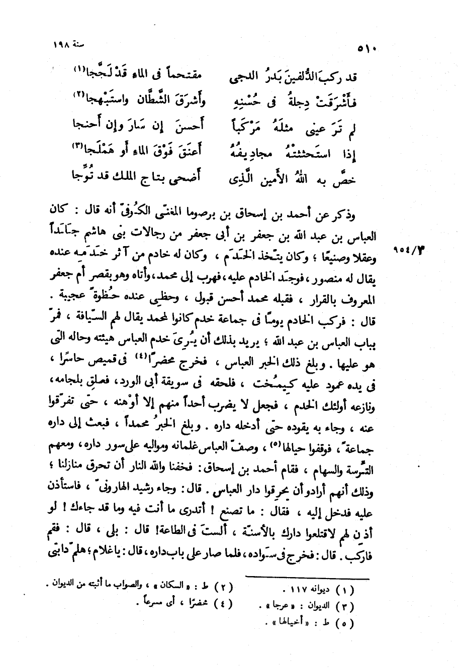 قَالَ: فركب الخادم يوما في جماعة خدم كانوا لمحمد يقال لهم السيافة، فمر بباب العباس بْن عبد الله، يريد بذلك أن يري خدم العباس هيئته وحاله التي هو عليها وبلغ ذلك الخبر العباس، فخرج محضرا في قميص حاسرا، في يده عمود عليه كيمخت، فلحقه في سويقة أبي الورد، فعلق بلجامه، ونازعه أولئك الخدم، فجعل لا يضرب أحدا منهم إلا أوهنة، حتى تفرقوا عنه، وجاء به يقوده حتى أدخله داره وبلغ الخبر محمدا، فبعث إلى داره جماعه، فوقفوا حيالها، وصف العباس غلمانه ومواليه على سور داره، ومعهم الترسه والسهام، فقام أحمد بْن إسحاق: فخفنا والله النار أن تحرق منازلنا، وذلك أنهم أرادوا أن يحرقوا دار العباس قَالَ: وجاء رشيد الهاروني، فاستأذن عليه فدخل إليه، فقال: ما تصنع! أتدري ما أنت فيه وما قد جاءك! لو أذن لهم لاقتلعوا دارك بالأسنة، ألست في الطاعة! قَالَ: بلى، قَالَ: فقم فاركب قَالَ: فخرج في سواده، فلما صار على باب داره، قَالَ: يا غلام، هلم دابتي