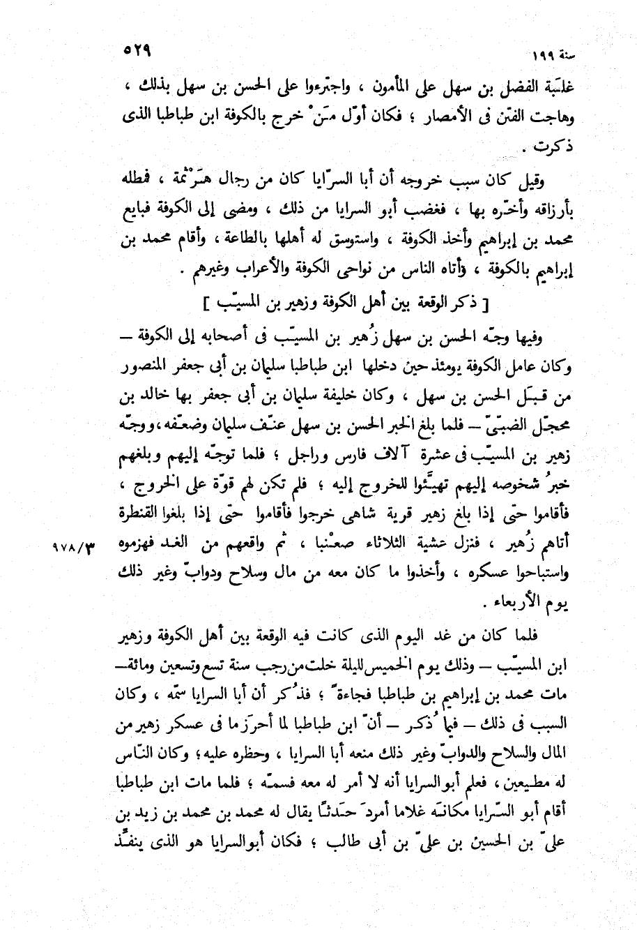 وفيها وجه الحسن بْن سهل زهير بْن المسيب في أصحابه إلى الكوفة- وكان عامل الكوفة يومئذ حين دخلها ابن طباطبا سليمان بْن أبي جعفر المنصور- من قبل الحسن بْن سهل، وكان خليفة سليمان بْن أبي جعفر بها خالد بْن محجل الضبي- فلما بلغ الخبر الحسن بْن سهل عنف سليمان وضعفه، ووجه زهير بْن المسيب في عشرة آلاف فارس وراجل، فلما توجه إليهم وبلغهم خبر شخوصه إليهم تهيئوا للخروج إليه، فلم تكن لهم قوة على الخروج، فأقاموا حتى إذا بلغ زهير قرية شاهي خرجوا فأقاموا حتى إذا بلغوا القنطرة أتاهم زهير، فنزل عشية الثلاثاء صعنبا، ثم واقعهم من الغد فهزموه واستباحوا عسكره، وأخذوا ما كان معه من مال وسلاح ودواب وغير ذلك يوم الأربعاء.