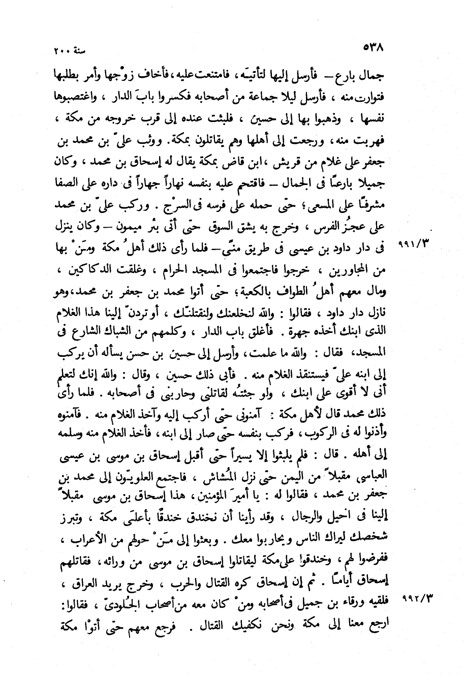 جمال بارع- فأرسل إليها لتأتيه، فامتنعت عليه، فأخاف زوجها وامر بطلبها فتوارت منه، فأرسل ليلا جماعة من أصحابه فكسروا باب الدار، واغتصبوها نفسها، وذهبوا بها إلى حسين، فلبثت عنده إلى قرب خروجه من مكة، فهربت منه، ورجعت إلى أهلها وهم يقاتلون بمكة ووثب علي بْن محمد بْن جعفر على غلام من قريش، ابن قاض بمكة يقال له إسحاق بْن محمد، وكان جميلا بارعا في الجمال- فاقتحم عليه بنفسه نهارا جهارا في داره على الصفا مشرفا على المسعى، حتى حمله على فرسه في السرج وركب علي بْن محمد على عجز الفرس، وخرج به يشق السوق حتى أتى بئر ميمون- وكان ينزل في دار داود بْن عيسى في طريق منى- فلما رأى ذلك أهل مكة ومن بها من المجاورين، خرجوا فاجتمعوا في المسجد الحرام، وغلقت الدكاكين، ومال معهم أهل الطواف بالكعبة، حتى أتوا محمد بْن جعفر بْن محمد، وهو نازل دار داود، فقالوا: والله لنخلعنك ولنقتلنك، أو تردن إلينا هذا الغلام الذي ابنك أخذه جهرة فأغلق باب الدار، وكلمهم من الشباك الشارع في المسجد، فقال: والله ما علمت، وأرسل إلى حسين بْن حسن يسأله أن يركب إلى ابنه علي فيستنقذ الغلام منه فأبى ذلك حسين، وقال: والله إنك لتعلم أني لا أقوى على ابنك، ولو جئته لقاتلني وحاربني في أصحابه فلما رأى ذلك محمد قَالَ لأهل مكة: آمنوني حتى أركب إليه وآخذ الغلام منه فآمنوه وأذنوا له في الركوب، فركب بنفسه حتى صار إلى ابنه، فأخذ الغلام منه وسلمه إلى أهله قَالَ: فلم يلبثوا إلا يسيرا حتى أقبل إسحاق بْن موسى بْن عيسى العباسي مقبلا من اليمن حتى نزل المشاش، فاجتمع العلويون إلى محمد بْن جعفر بْن محمد، فقالوا له: يا أمير المؤمنين، هذا إسحاق بْن موسى مقبلا إلينا في الخيل والرجال، وقد رأينا أن نخندق خندقا بأعلى مكة، وتبرز شخصك ليراك الناس ويحاربوا معك وبعثوا إلى من حولهم من الأعراب، ففرضوا لهم، وخندقوا على مكة ليقاتلوا إسحاق بْن موسى من ورائه، فقاتلهم إسحاق أياما ثم أن إسحاق كره القتال والحرب، وخرج يريد العراق، فلقيه ورقاء بْن جميل في أصحابه ومن كان معه من اصحاب الجلودي، فقالوا: