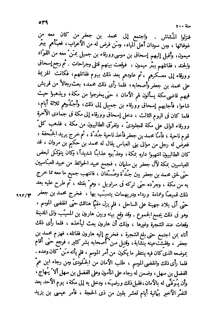 فنزلوا المشاش واجتمع إلى محمد بْن جعفر من كان معه من غوغائها، ومن سودان أهل المياه، ومن فرض له من الأعراب، فعبأهم ببئر ميمون، وأقبل إليهم إسحاق بْن موسى وورقاء بْن جميل بمن معه من القواد والجند، فقاتلهم ببئر ميمون، فوقعت بينهم قتلى وجراحات ثم رجع إسحاق وورقاء إلى معسكرهم، ثم عاودهم بعد ذلك بيوم فقاتلهم، فكانت الهزيمة على محمد بْن جعفر وأصحابه، فلما رأى ذلك محمد، بعث رجالا من قريش فيهم قاضي مكة يسألون لهم الأمان، حتى يخرجوا من مكة، ويذهبوا حيث شاءوا، فأجابهم إسحاق وورقاء بْن جميل إلى ذلك، وأجلوهم ثلاثة أيام، فلما كان في اليوم الثالث، دخل إسحاق وورقاء إلى مكة في جمادى الآخرة وورقاء الوالي على مكة للجلودي، وتفرق الطالبيون من مكة، فذهب كل قوم ناحية، فأما محمد بْن جعفر فأخذ ناحية جده، ثم خرج يريد الجحفة، فعرض له رجل من موالي بني العباس يقال له محمد بْن حكيم بْن مروان، قد كان الطالبيون انتهبوا داره بمكة، وعذبوه عذابا شديدا، وكان يتوكل لبعض العباسيين بمكة لآل جعفر بْن سليمان، فجمع عبيد الحوائط من عبيد العباسيين حتى لحق محمد بْن جعفر بين جدة وعسفان، فانتهب جميع ما معه مما خرج به من مكة، وجرده حتى تركه في سراويل، وهم بقتله، ثم طرح عليه بعد ذلك قميصا وعمامة ورداء ودريهمات يتسبب بها، فخرج محمد بْن جعفر حتى أتى بلاد جهينة على الساحل، فلم يزل مقيما هنالك حتى انقضى الموسم، وهو في ذلك يجمع الجموع وقد وقع بينه وبين هارون بْن المسيب والي المدينة وقعات عند الشجرة وغيرها، وذلك أن هارون بعث ليأخذه، فلما راى ذلك أتاه بمن اجتمع حتى بلغ الشجرة، فخرج إليه هارون فقاتله، فهزم محمد بْن جعفر، وفقئت عينه بنشابة، وقتل من أصحابه بشر كثير، فرجع حتى أقام بموضعه الذي كان فيه ينتظر ما يكون من أمر الموسم، فلم يأته من كان وعده فلما رأى ذلك وانقضى الموسم، طلب الأمان من الجلودي ومن رجاء ابن عم الفضل بْن سهل، وضمن له رجاء على المأمون وعلى الفضل بْن سهل ألا يهاج، وأن يوفى له بالأمان، فقبل ذلك ورضيه، ودخل به إلى مكة، يوم الأحد بعد النفر الأخير بثمانية أيام لعشر بقين من ذي الحجة، فأمر عيسى بْن يزيد