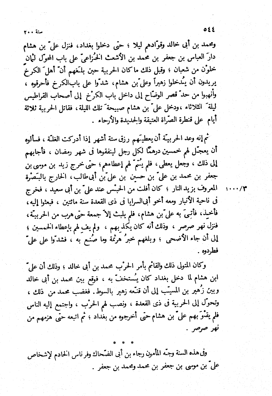 ومحمد بْن أبي خالد وقوادهم ليلا، حتى دخلوا بغداد، فنزل علي بْن هشام دار العباس بْن جعفر بْن محمد بْن الأشعث الخزاعي على باب المحول لثمان خلون من شعبان، وقبل ذلك ما كان الحربية حين بلغهم أن أهل الكرخ يريدون أن يدخلوا زهيرا وعلي بْن هشام، شدوا على باب الكرخ فاحرقوه، وانهبوا من حد قصر الوضاح إلى داخل باب الكرخ إلى أصحاب القراطيس ليلة الثلاثاء، ودخل علي بْن هشام صبيحة تلك الليلة، فقاتل الحربية ثلاثة أيام على قنطرة الصراة العتيقة والجديدة والأرحاء.