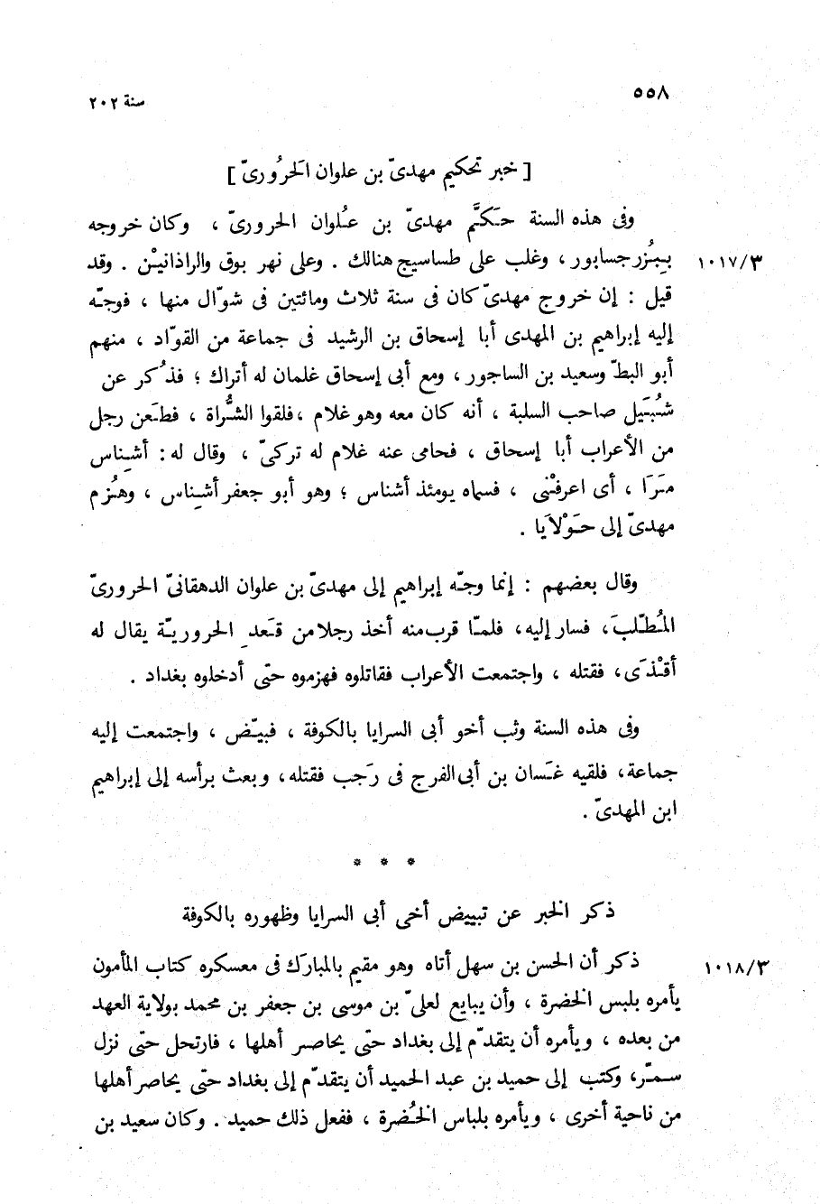 وفي هذه السنة حكم مهدي بْن علوان الحروري، وكان خروجه ببزرجسابور، وغلب على طساسيج هنالك وعلى نهر بوق والراذانين وقد قيل: إن خروج مهدي كان في سنة ثلاث ومائتين في شوال منها، فوجه إليه إبراهيم بْن المهدي أبا إسحاق بن الرشيد في جماعة من القواد، منهم أبو البط وسعيد بْن الساجور، ومع أبي إسحاق غلمان له أتراك، فذكر عن شبيل صاحب السلبة، أنه كان معه وهو غلام، فلقوا الشراة، فطعن رجل من الأعراب أبا إسحاق، فحامى عنه غلام له تركي، وقال له: أشناس مرا، أي اعرفني، فسماه يومئذ أشناس، وهو أبو جعفر أشناس، وهزم مهدي إلى حولايا.