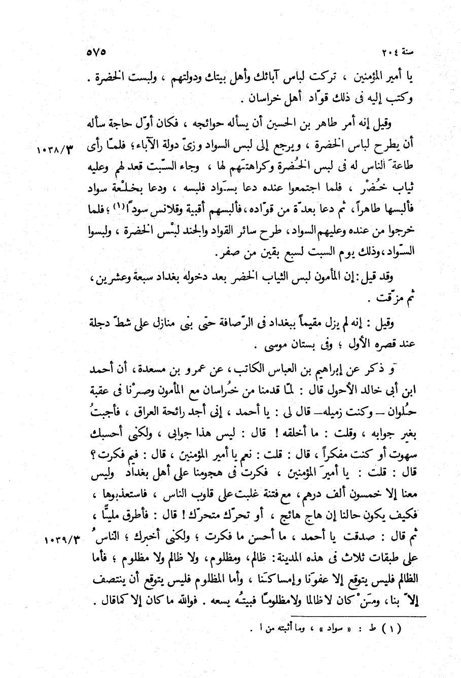 وقيل إنه أمر طاهر بْن الحسين أن يسأله حوائجه، فكان أول حاجة سأله أن يطرح لباس الخضرة، ويرجع إلى لبس السواد وزي دولة الآباء، فلما رأى طاعة الناس له في لبس الخضرة وكراهتهم لها، وجاء السبت قعد لهم وعليه ثياب خضر، فلما اجتمعوا عنده دعا بسواد فلبسه، ودعا بخلعه سواد فألبسها طاهرا، ثم دعا بعدة من قواده، فألبسهم أقبية وقلانس سودا، فلما خرجوا من عنده وعليهم السواد، طرح سائر القواد والجند لبس الخضرة، ولبسوا السواد، وذلك يوم السبت لسبع بقين من صفر.