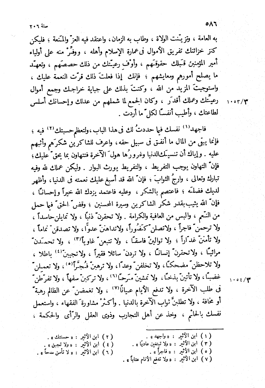 فاجهد نفسك فيما حددت لك في هذا الباب، ولتعظم حسبتك فيه، فإنما يبقى من المال ما أنفق في سبيل حقه، واعرف للشاكرين شكرهم وأثبهم عليه وإياك أن تنسيك الدنيا وغرورها هول الآخرة فتتهاون بما يحق عليك، فإن التهاون يوجب التفريط، والتفريط يورث البوار وليكن عملك لله وفيه تبارك وتعالى، وارج الثواب، فإن الله قد أسبغ عليك نعمته في الدنيا، وأظهر لديك فضله، فاعتصم بالشكر، وعليه فاعتمد يزدك الله خيرا وإحسانا، فإن الله يثيب بقدر شكر الشاكرين وسيرة المحسنين، وقض الحق فيما حمل من النعم، وألبس من العافية والكرامة ولا تحقرن ذنبا، ولا تمايلن حاسدا، ولا ترحمن فاجرا، ولا تصلن كفورا، ولا تداهنن عدوا، ولا تصدقن نماما، ولا تأمنن غدارا، ولا توالين فاسقا، ولا تتبعن غاويا، ولا تحمدن مرائيا، ولا تحقرن إنسانا، ولا تردن سائلا فقيرا، ولا تجيبن باطلا، ولا تلاحظن مضحكا، ولا تخلفن وعدا، ولا ترهبن فجرا، ولا تعملن غضبا، ولا تأتين بذخا، ولا تمشين مرحا، ولا تركبن سفها، ولا تفرطن في طلب الآخرة، ولا تدفع الأيام عيانا، ولا تغمضن عن الظالم رهبة أو مخافة، ولا تطلبن ثواب الآخرة بالدنيا وأكثر مشاورة الفقهاء، واستعمل نفسك بالحلم، وخذ عن أهل التجارب وذوي العقل والرأي والحكمة،