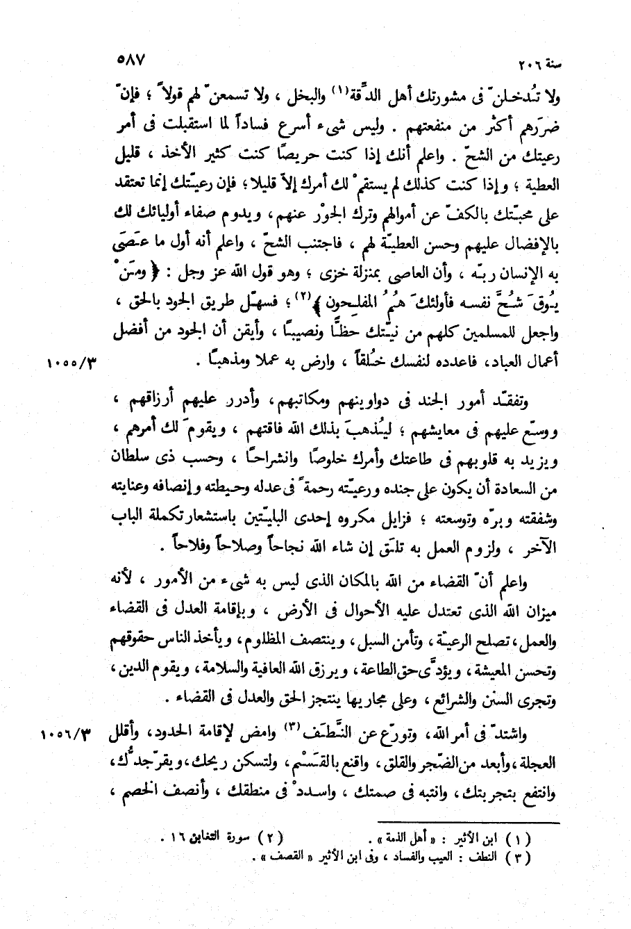 وتفقد أمور الجند في دواوينهم ومكاتبهم، وأدرر عليهم أرزاقهم، ووسع عليهم في معايشهم، ليذهب بذلك الله فاقتهم، ويقوم لك أمرهم، ويزيد به قلوبهم في طاعتك وأمرك خلوصا وانشراحا، وحسب ذي سلطان من السعادة أن يكون على جنده ورعيته رحمة في عدله وحيطته وإنصافه وعنايته وشفقته وبره وتوسعته، فزايل مكروه إحدى البليتين باستشعار تكملة الباب الآخر، ولزوم العمل به تلق إن شاء الله نجاحا وصلاحا وفلاحا.