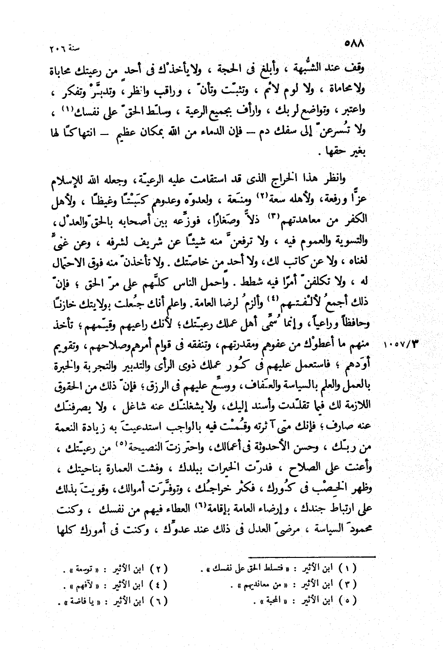وقف عند الشبهة، وأبلغ في الحجة، ولا يأخذك في أحد من رعيتك محاباة ولا محاماة، ولا لوم لائم، وتثبت وتأن، وراقب وانظر، وتدبر وتفكر، واعتبر، وتواضع لربك، وارأف بجميع الرعية، وسلط الحق على نفسك، ولا تسرعن إلى سفك دم- فإن الدماء من الله بمكان عظيم- انتهاكا لها بغير حقها وانظر هذا الخراج الذي قد استقامت عليه الرعية، وجعله الله للإسلام عزا ورفعة، ولأهله سعة ومنعة، ولعدوه وعدوهم كبتا وغيظا، ولأهل الكفر من معاهدتهم ذلا وصغارا، فوزعه بين أصحابه بالحق والعدل، والتسوية والعموم فيه، ولا ترفعن منه شيئا عن شريف لشرفه، وعن غني لغناه، ولا عن كاتب لك، ولا أحد من خاصتك، ولا تأخذن منه فوق الاحتمال له، ولا تكلفن أمرا فيه شطط واحمل الناس كلهم على مر الحق، فإن ذلك أجمع لألفتهم وألزم لرضا العامة واعلم أنك جعلت بولايتك خازنا وحافظا وراعيا، وإنما سمي أهل عملك رعيتك، لأنك راعيهم وقيمهم، تأخذ منهم ما أعطوك من عفوهم ومقدرتهم، وتنفقه في قوام أمرهم وصلاحهم، وتقويم أودهم، فاستعمل عليهم في كور عملك ذوي الرأي والتدبير والتجربه والخبره بالعمل والعلم بالسياسة والعفاف، ووسع عليهم في الرزق، فإن ذلك من الحقوق اللازمة لك فيما تقلدت وأسند إليك، ولا يشغلنك عنه شاغل، ولا يصرفنك عنه صارف، فإنك متى آثرته وقمت فيه بالواجب استدعيت به زيادة النعمة من ربك، وحسن الاحدوثه في اعمالك، واحترزت النصيحة من رعيتك، وأعنت على الصلاح، فدرت الخيرات ببلدك، وفشت العمارة بناحيتك، وظهر الخصب في كورك، فكثر خراجك، وتوفرت أموالك، وقويت بذلك على ارتباط جندك، وإرضاء العامة بإقامة العطاء فيهم من نفسك، وكنت محمود السياسة، مرضي العدل في ذلك عند عدوك، وكنت في أمورك كلها