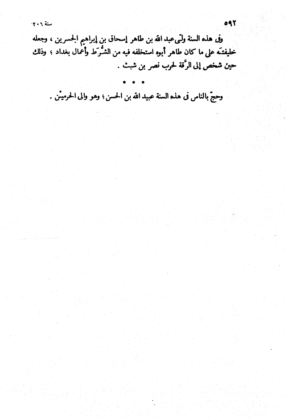 وفي هذه السنة ولى عبد الله بن طاهر إسحاق بْن إبراهيم الجسرين، وجعله خليفته على ما كان طاهر أبوه استخلفه فيه من الشرط وأعمال بغداد، وذلك حين شخص إلى الرقة لحرب نصر بْن شبث.