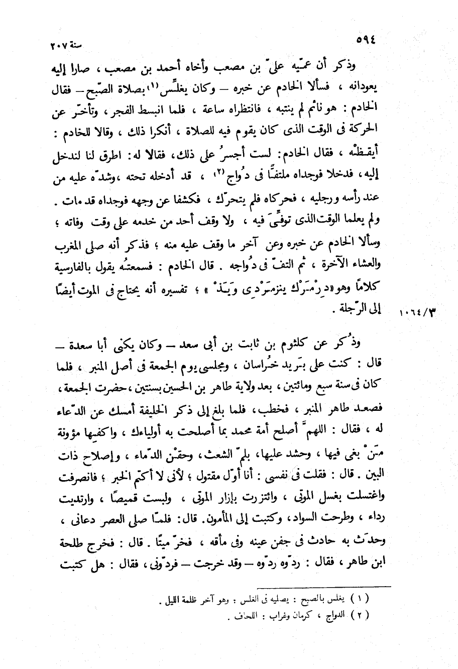 وذكر عن كلثوم بْن ثابت بْن أبي سعد- وكان يكنى أبا سعدة- قَالَ: كنت على بريد خراسان، ومجلسي يوم الجمعة في أصل المنبر، فلما كان في سنة سبع ومائتين، بعد ولاية طاهر بْن الحسين بسنتين، حضرت الجمعة، فصعد طاهر المنبر، فخطب، فلما بلغ إلى ذكر الخليفة أمسك عن الدعاء له، فقال: اللهم أصلح أمة محمد بما اصلحت به أولياءك، واكفها مئونة من بغى فيها، وحشد عليها، بلم الشعث، وحقن الدماء، وإصلاح ذات البين قَالَ: فقلت في نفسي: أنا أول مقتول، لأني لا أكتم الخبر، فانصرفت واغتسلت بغسل الموتى، وائتزرت بإزار الموتى، ولبست قميصا، وارتديت رداء، وطرحت السواد، وكتبت إلى المأمون قَالَ: فلما صلى العصر دعاني، وحدث به حادث في جفن عينه وفي مأقه، فخر ميتا قَالَ: فخرج طلحه ابن طاهر، فقال: ردوه ردوه- وقد خرجت- فردوني، فقال: هل كتبت