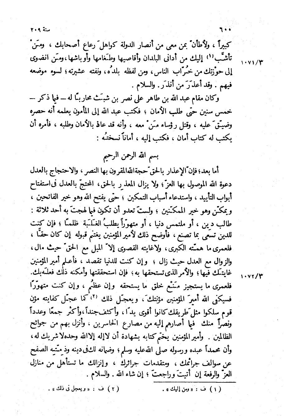 وكان مقام عبد الله بْن طاهر على نصر بْن شبث محاربا له- فيما ذكر- خمس سنين حتى طلب الأمان، فكتب عبد الله إلى المأمون يعلمه أنه حصره وضيق عليه، وقتل رؤساء من معه، وإنه قد عاذ بالأمان وطلبه، فأمره أن يكتب له كتاب أمان، فكتب اليه، أمانا نسخته: