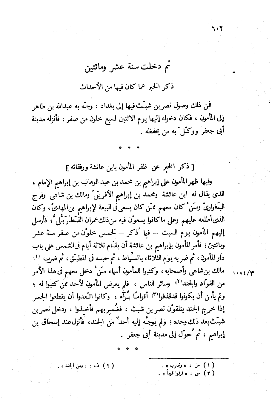 (ذكر الخبر عما كَانَ فِيهَا من الأحداث) فمن ذلك وصول نصر بْن شبث فيها إلى بغداد، وجه به عبد الله بْن طاهر إلى المأمون، فكان دخوله إليها يوم الاثنين لسبع خلون من صفر، فأنزله مدينة أبي جعفر ووكل به من يحفظه.
