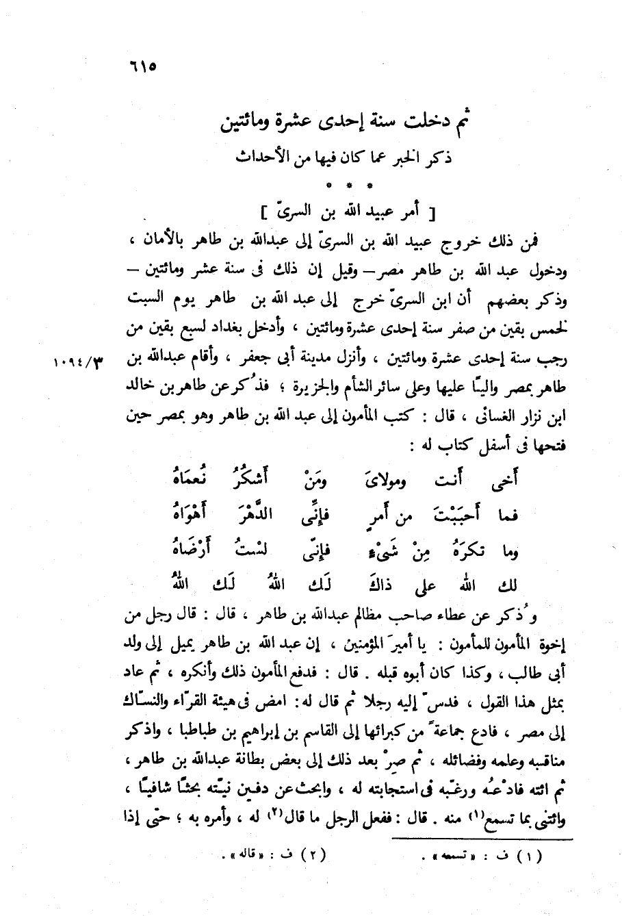 فمن ذلك خروج عبيد الله بْن السري إلى عبد الله بْن طاهر بالأمان، ودخول عبد الله بْن طاهر مصر- وقيل إن ذلك في سنة عشر ومائتين- وذكر بعضهم أن ابن السري خرج إلى عبد الله بْن طاهر يوم السبت لخمس بقين من صفر سنة إحدى عشرة ومائتين، وأدخل بغداد لسبع بقين من رجب سنة إحدى عشرة ومائتين، وأنزل مدينة أبي جعفر، وأقام عبد الله بْن طاهر بمصر واليا عليها وعلى سائر الشام والجزيرة، فذكر عن طاهر بْن خالد ابن نزار الغساني، قَالَ: كتب المأمون إلى عبد الله بْن طاهر وهو بمصر حين فتحها في أسفل كتاب له: