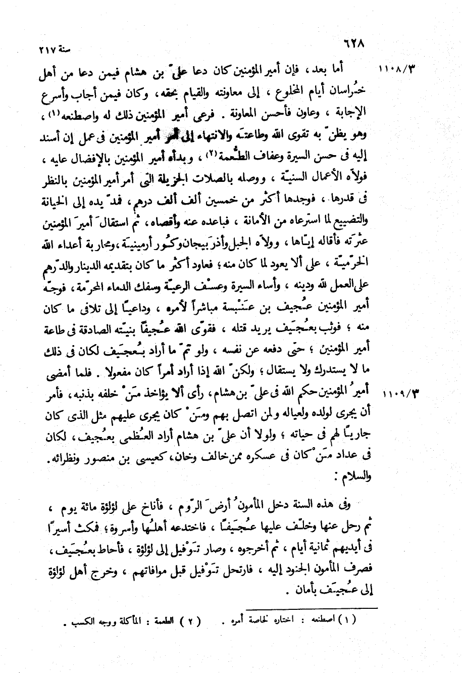 أما بعد، فإن أمير المؤمنين كان دعا علي بْن هشام فيمن دعا من أهل خراسان أيام المخلوع، إلى معاونته والقيام بحقه، وكان فيمن أجاب وأسرع الإجابة، وعاون فأحسن المعاونة فرعى أمير المؤمنين ذلك له واصطنعه، وهو يظن به تقوى الله وطاعته والانتهاء إلى أمر أمير المؤمنين في عمل إن أسند إليه في حسن السيرة وعفاف الطعمة، وبدأه أمير المؤمنين بالإفضال عليه، فولاه الأعمال السنية، ووصله بالصلات الجزيلة التي أمر أمير المؤمنين بالنظر في قدرها، فوجدها أكثر من خمسين ألف ألف درهم، فمد يده إلى الخيانة والتضييع لما استرعاه من الأمانة، فباعده عنه وأقصاه، ثم استقال أمير المؤمنين عثرته فأقاله إياها، وولاه الجبل وأذربيجان وكور أرمينية، ومحاربه أعداء الله الخرمية، على الا يعود لما كان منه، فعاود أكثر ما كان بتقديمه الدينار والدرهم على العمل لله ودينه، وأساء السيرة وعسف الرعية وسفك الدماء المحرمة، فوجه أمير المؤمنين عجيف بْن عنبسة مباشرا لأمره، وداعيا إلى تلافي ما كان منه، فوثب بعجيف يريد قتله، فقوى الله عجيفا بنيته الصادقة في طاعة أمير المؤمنين، حتى دفعه عن نفسه، ولو تم ما أراد بعجيف لكان في ذلك ما لا يستدرك ولا يستقال، ولكن الله إذا أراد أمرا كان مفعولا فلما أمضى أمير المؤمنين حكم الله في علي بْن هشام، رأى الا يؤاخذ من خلفه بذنبه، فأمر أن يجري لولده ولعياله ولمن أتصل بهم ومن كان يجري عليهم مثل الذي كان جاريا لهم في حياته، ولولا أن علي بْن هشام أراد العظمى بعجيف، لكان في عداد من كان في عسكره ممن خالف وخان، كعيسى بْن منصور ونظرائه.