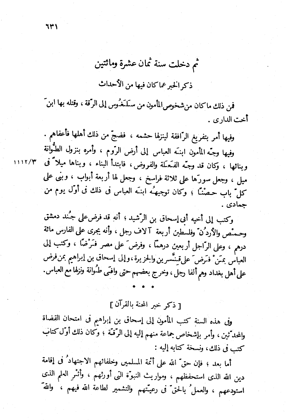 وفي هذه السنة كتب المأمون إلى إسحاق بْن إبراهيم في امتحان القضاة والمحدثين، وأمر بإشخاص جماعة منهم إليه إلى الرقة، وكان ذلك أول كتاب كتب في ذلك، ونسخة كتابه إليه: