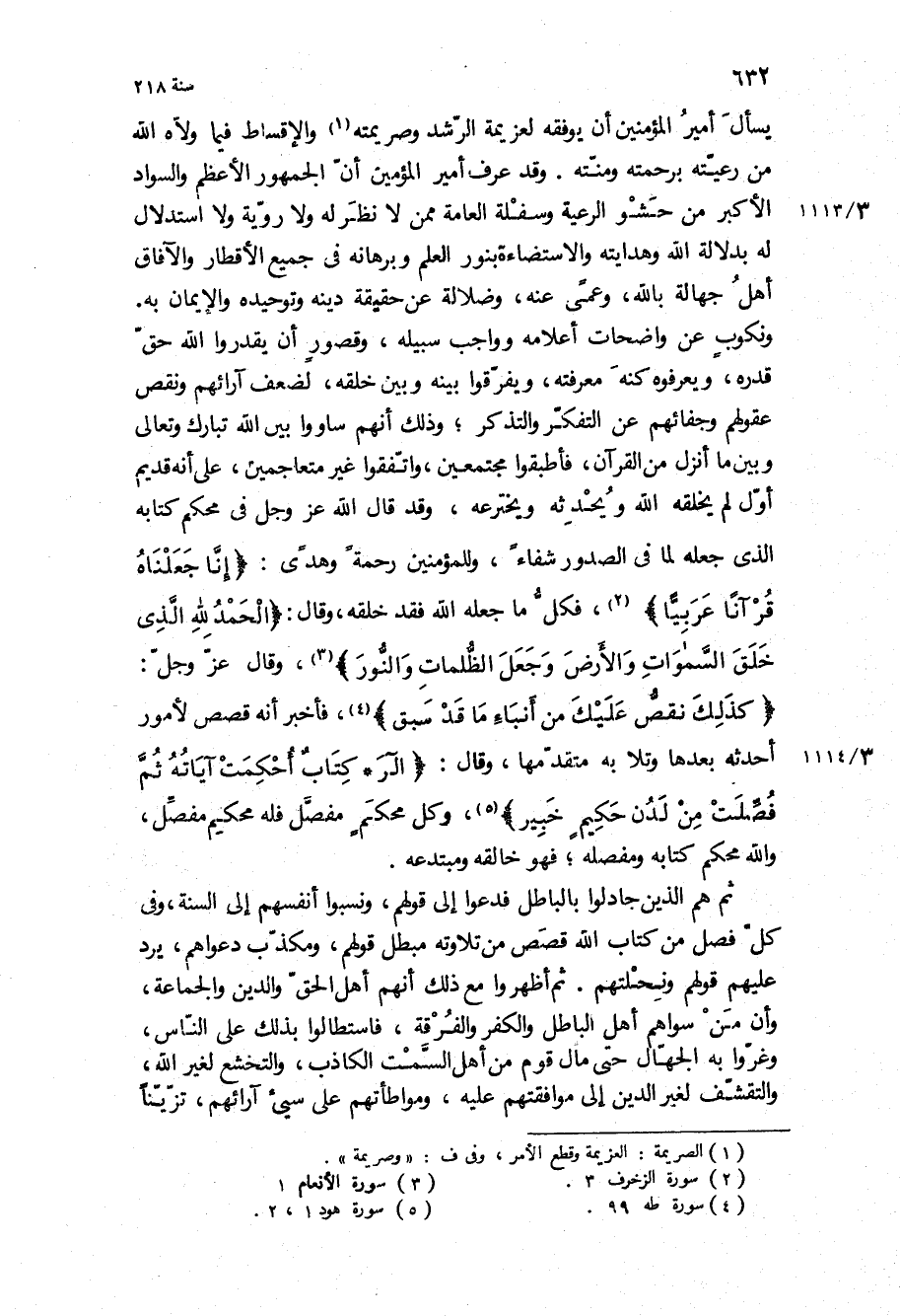 يسأل أمير المؤمنين أن يوفقه لعزيمة الرشد وصريمته والإقساط فيما ولاه الله من رعيته برحمته ومنته وقد عرف أمير المؤمنين أن الجمهور الأعظم والسواد الأكبر من حشو الرعية وسفلة العامة ممن لا نظر له ولا روية ولا استدلال له بدلالة الله وهدايته والاستضاءة بنور العلم وبرهانه في جميع الأقطار والآفاق أهل جهالة بالله، وعمى عنه، وضلالة عن حقيقة دينه وتوحيده والإيمان به.