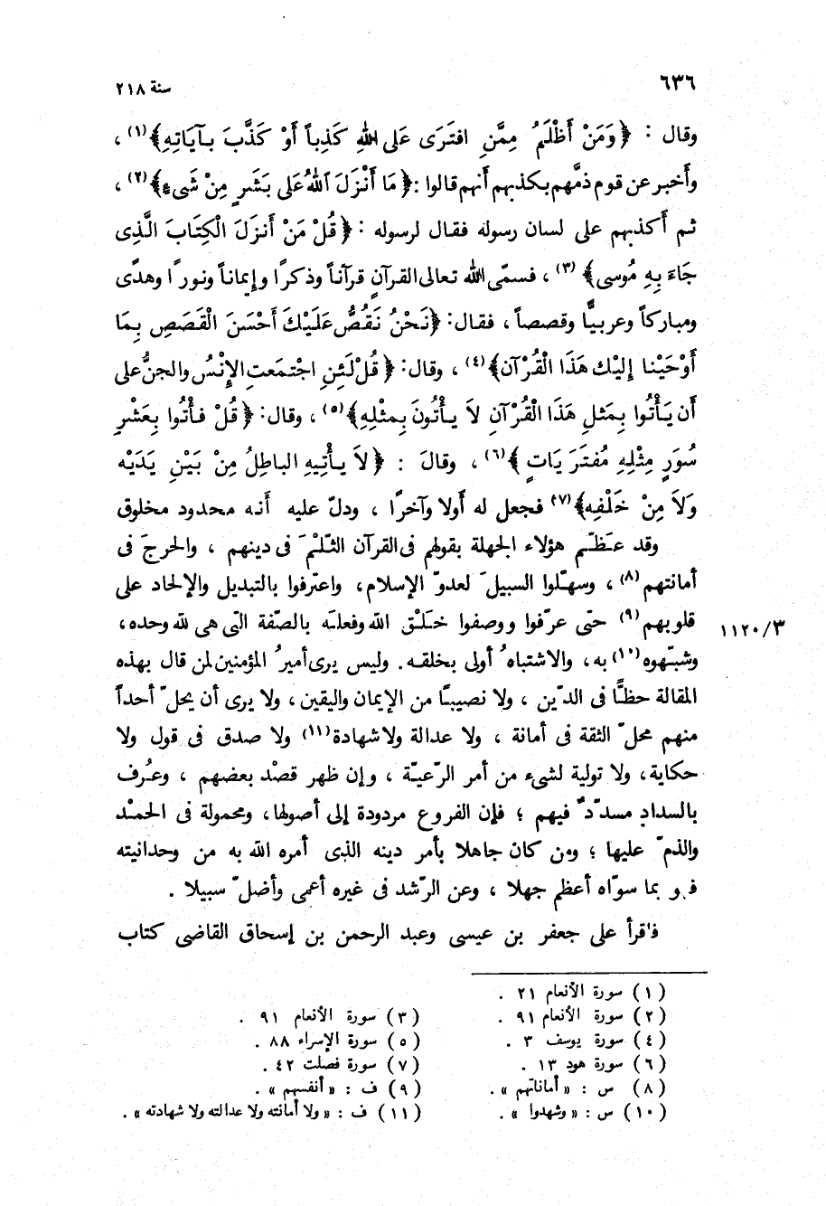 وقال: «وَمَنْ أَظْلَمُ مِمَّنِ افْتَرى عَلَى اللَّهِ كَذِباً أَوْ كَذَّبَ بِآياتِهِ» ، وأخبر عن قوم ذمهم بكذبهم إنهم قالوا: «مَا أَنْزَلَ اللَّهُ عَلى بَشَرٍ مِنْ شَيْءٍ» ، ثم أكذبهم على لسان رسوله فقال لرسوله: «قُلْ مَنْ أَنْزَلَ الْكِتابَ الَّذِي جاءَ بِهِ مُوسى» ، فسمى الله تعالى القرآن قرآنا وذكرا وإيمانا ونورا وهدى ومباركا وعربيا وقصصا، فقال: «نَحْنُ نَقُصُّ عَلَيْكَ أَحْسَنَ الْقَصَصِ بِما أَوْحَيْنا إِلَيْكَ هذَا الْقُرْآنَ» ، وقال: «قُلْ لَئِنِ اجْتَمَعَتِ الْإِنْسُ وَالْجِنُّ عَلى أَنْ يَأْتُوا بِمِثْلِ هذَا الْقُرْآنِ لا يَأْتُونَ بِمِثْلِهِ» ، وقال: «قُلْ فَأْتُوا بِعَشْرِ سُوَرٍ مِثْلِهِ مُفْتَرَياتٍ» ، وقال: «لا يَأْتِيهِ الْباطِلُ مِنْ بَيْنِ يَدَيْهِ وَلا مِنْ خَلْفِهِ» فجعل له أولا وآخرا، ودل عليه أنه محدود مخلوق وقد عظم هؤلاء الجهلة بقولهم في القرآن الثلم في دينهم، والحرج في أمانتهم، وسهلوا السبيل لعدو الإسلام، واعترفوا بالتبديل والإلحاد على قلوبهم حتى عرفوا ووصفوا خلق الله وفعله بالصفة التي هي لله وحده، وشبهوه به، والاشتباه أولى بخلقه وليس يرى أمير المؤمنين لمن قَالَ بهذه المقالة حظا في الدين، ولا نصيبا من الإيمان واليقين، ولا يرى أن يحل أحدا منهم محل الثقة في أمانة، ولا عدالة ولا شهادة ولا صدق في قول ولا حكاية، ولا تولية لشيء من أمر الرعية، وإن ظهر قصد بعضهم، وعرف بالسداد مسدد فيهم، فإن الفروع مردودة إلى أصولها، ومحمولة في الحمد والذم عليها، ومن كان جاهلا بأمر دينه الذي أمره الله به من وحدانيته فهو بما سواه أعظم جهلا، وعن الرشد في غيره أعمى وأضل سبيلا.